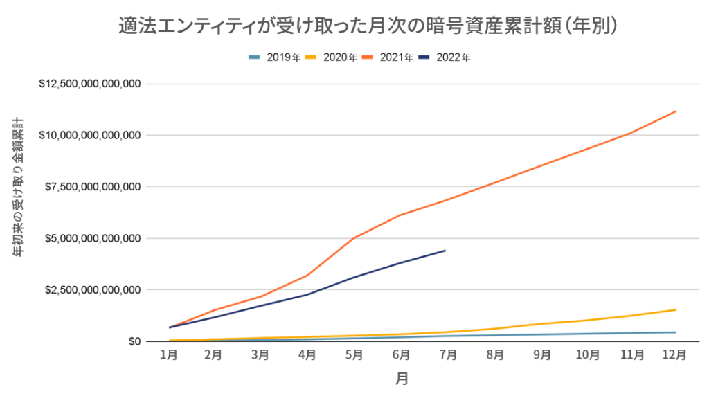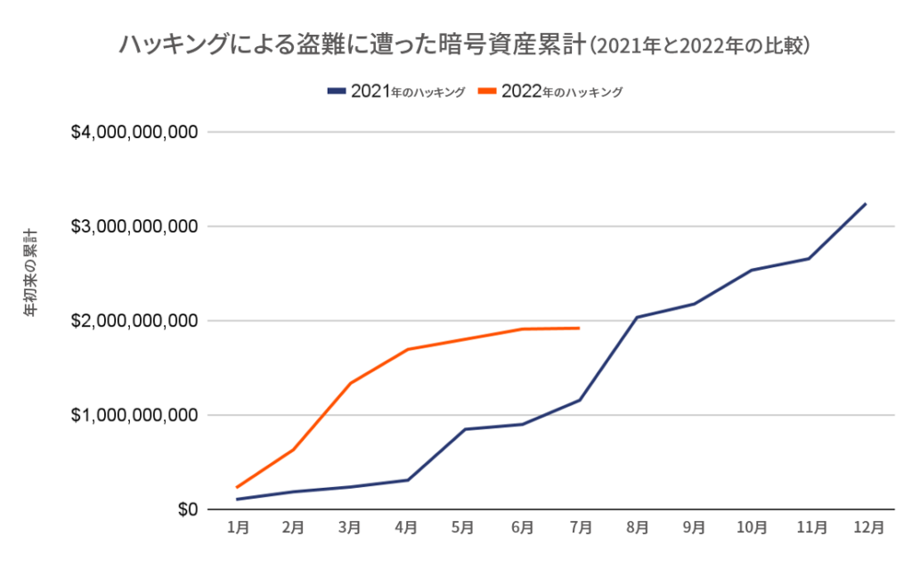 2022年7月末までに、ハッキングによってサービスが盗難に遭った暗号資産は19億ドル相当に上りますが、これは2021年の同時期では、12億ドルを若干下回る程度でした。このような傾向がすぐに逆転するようには思われません。既に8月の初週には、クロスチェーンブリッジであるNomadに対する1億9,000万ドルのハッキング、複数のSolanaウォレットで500万ドルのハッキングが発生しています(いずれのケースも7月末までを対象とする上記のグラフには含まれていません)。