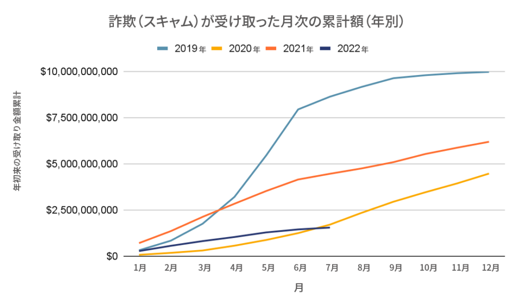 2022年上半期に詐欺行為(スキャム)によって不正に得られた現在までの収益は16億ドルで、2021年同期比では65%の減少となっています。この減少は、通貨全体の価格の下落に連動しているように見受けられます。