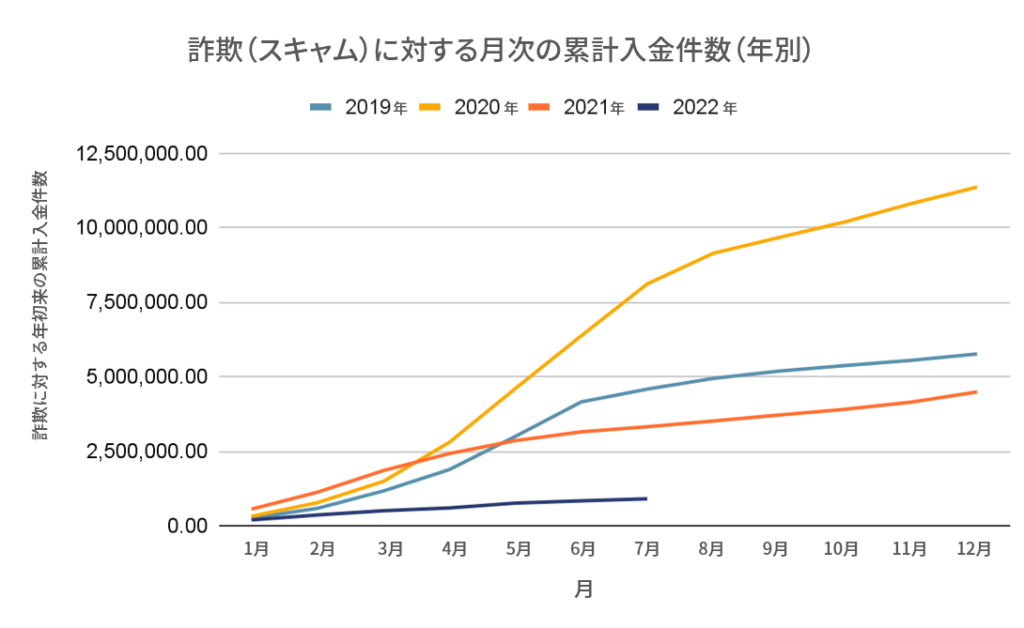2022年に入り、詐欺行為によって得られた収益は、Bitcointの価格とほぼ一致する形で減少しています。また、下図のように、減少しているのは詐欺による収益だけではありません。2022年上半期の詐欺行為に対する累積入金件数は、過去4年間で最も低くなっています。