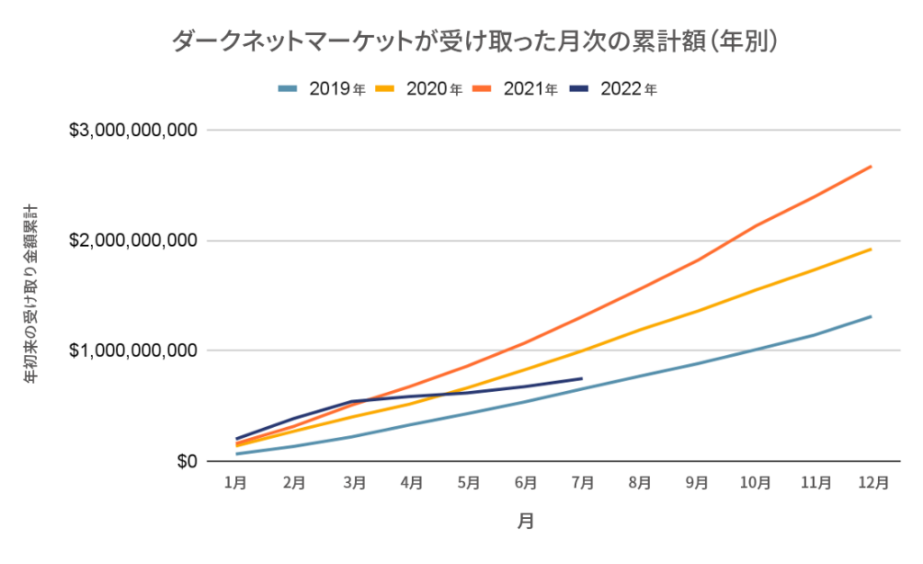 2022年1月~7月のダークネットマーケットの収益も、大幅な下落が見られました。2022年7月は、前年同月に比べて43%減少しています。しかし詐欺とは大きく異なり、年間を通じて同様の状況だったわけではありません。2022年上半期のダークネットマーケットの収益は、4月までは2021年を上回り、そこから増加率の減少が始まっています。これは、4月5日に発生したHydra Marketplaceの停止と制裁によるものだと言っても良いでしょう。Hydraは何年もの間、支配的なダークネットマーケットとして、ドラッグの販売だけでなく、ハッキングツールや盗難データの販売、マネーロンダリングサービスなどのハブとして機能してきました。