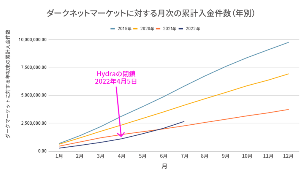 注目すべきは、Hydraの停止後にダークネットマーケット全体の収益が減少する一方で、その他のマーケットでは個々の入金件数が大幅に増加している点です。