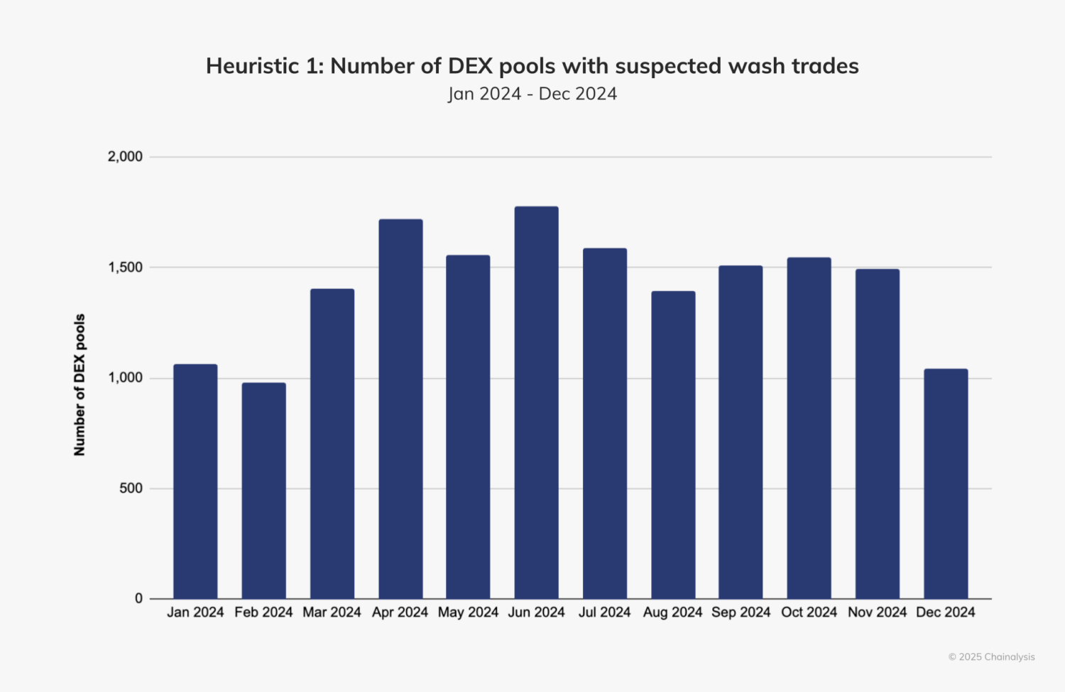 For instance, in April, five DEX pools accounted for a total of $78 million worth of suspected wash trading. Although suspected wash trading volumes fluctuated throughout the year, the number of DEX pools with associated activity remained fairly consistent, averaging around 1,000 to 1,800 pools per month, or between 0.2 and 0.3% of the approximately 500,000 pools active monthly, suggesting that wash trading may be concentrated in specific pools and/or driven by a small number of actors with targeted efforts.