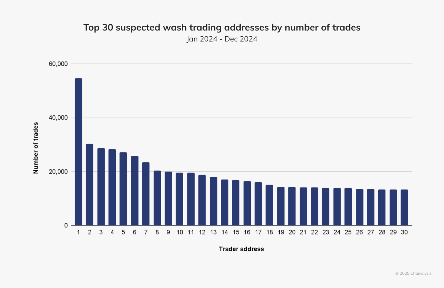 One address in 2024 initiated more than 54,000 buy-and-sell transactions of almost identical amounts — very suspicious in itself — illustrating the scale of this potential activity.