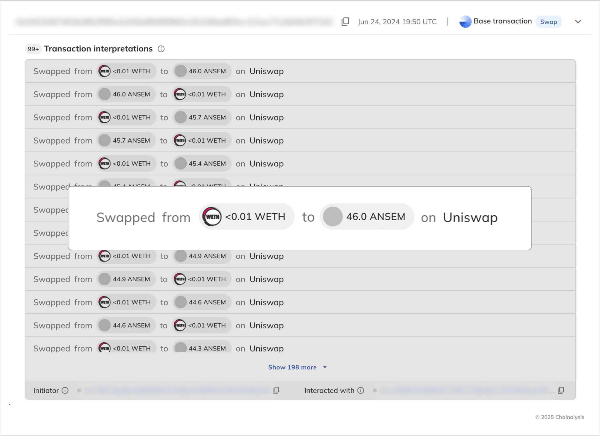 We were able to identify a total of 23,436 unique addresses across Ethereum, BNB, and Base exhibiting activity consistent with the Heuristic 1 criteria. On average, each address engaged with two DEX pools and initiated 129 suspected wash trades of $30,033 in total volume during the time period studied. However, as shown in the table below, addresses that traded with four or more DEX pools accounted for 10% of total addresses identified by Heuristic 1. These addresses accounted for 43% of the total suspected wash trading volume in 2024.