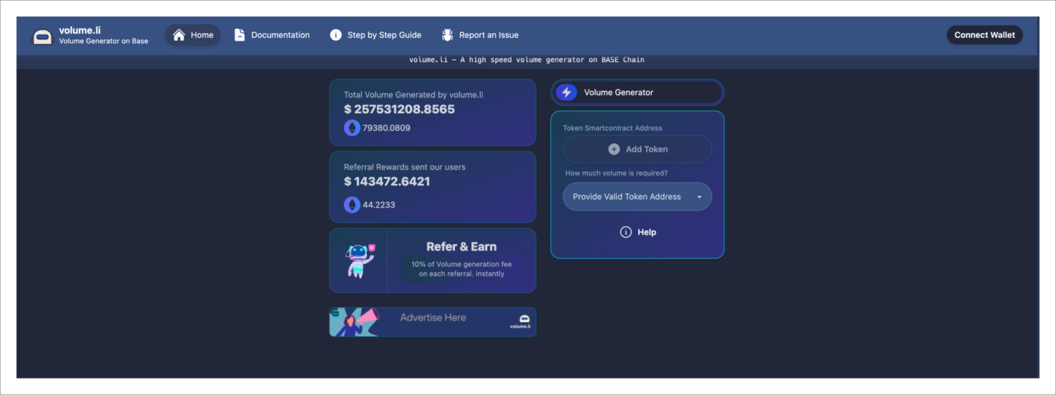 Customers have the option of purchasing bots of varying degrees of volume, from $50 to $100,000, within 24 hours. The Volume.li site states that a bot generating $100,000 in volume within 24 hours costs 0.212 ETH. After the customer pays this fee, the bot will buy and sell a token 100 times in rapid succession.