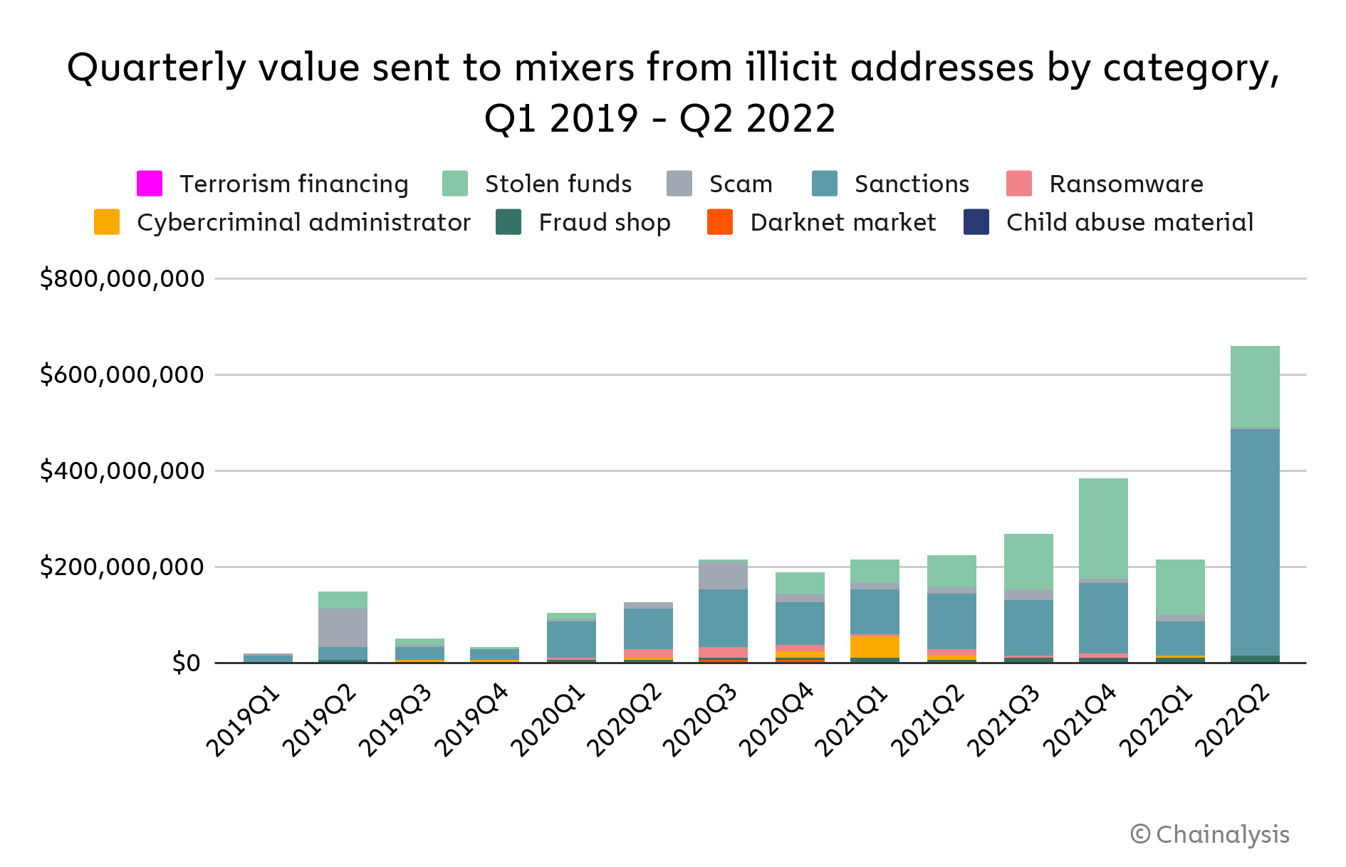 Funds sent to mixers by cybercriminal groups associated with Russia, and especially those associated with North Korea, have risen dramatically in 2021 and 2022.