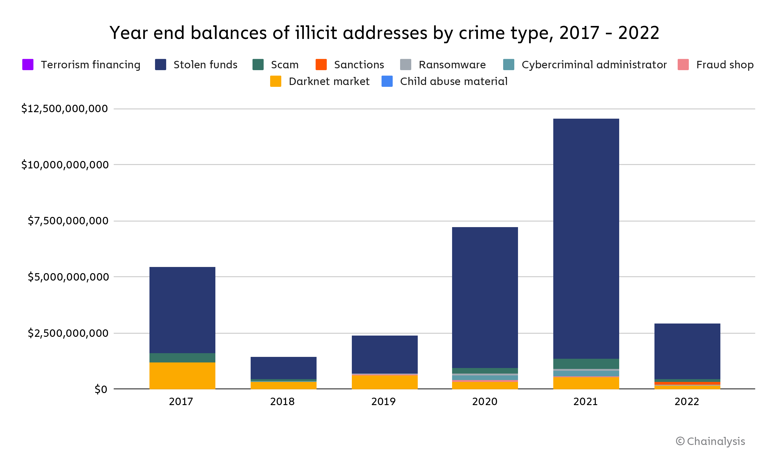 Two things stand out: The first is that criminal balances have plummeted in value in 2022, from $12 billion at the end of 2021 to just $2.9 billion. Price declines in the ongoing bear market and large, successful seizures by law enforcement in 2022 are the most likely causes of this.