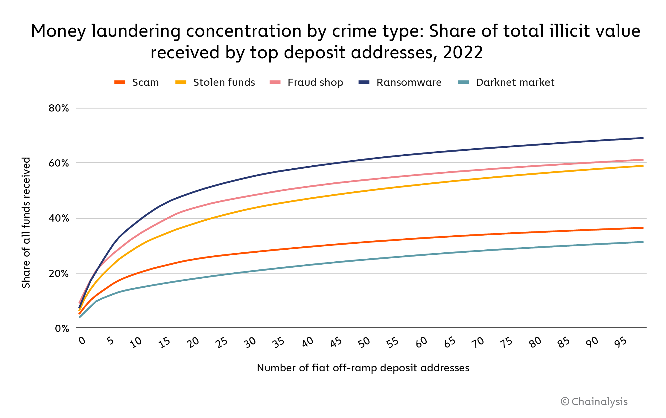 Just 21 deposit addresses account for 50% of all funds sent from ransomware to fiat off-ramps, while the top 21 deposit addresses for funds received from darknet markets account for just 18%.