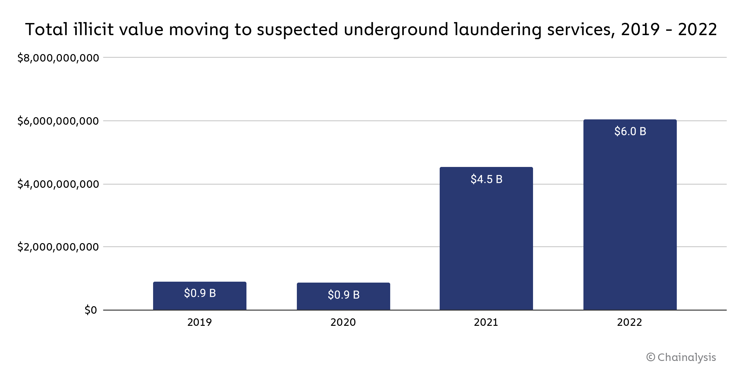 Total cryptocurrency moving to wallets fitting those criteria has grown over the last few years, and hit $6 billion in 2022. Again, these are estimates — we can’t guarantee that all of the wallets included in this analysis are necessarily underground laundering services, but their on-chain activity suggests that they could be. It’s also possible that usage of underground money laundering services will pick up as high-risk exchanges, which have facilitated this activity in the past, face increased pressure from law enforcement, as we saw with Garantex and Bitzlato.