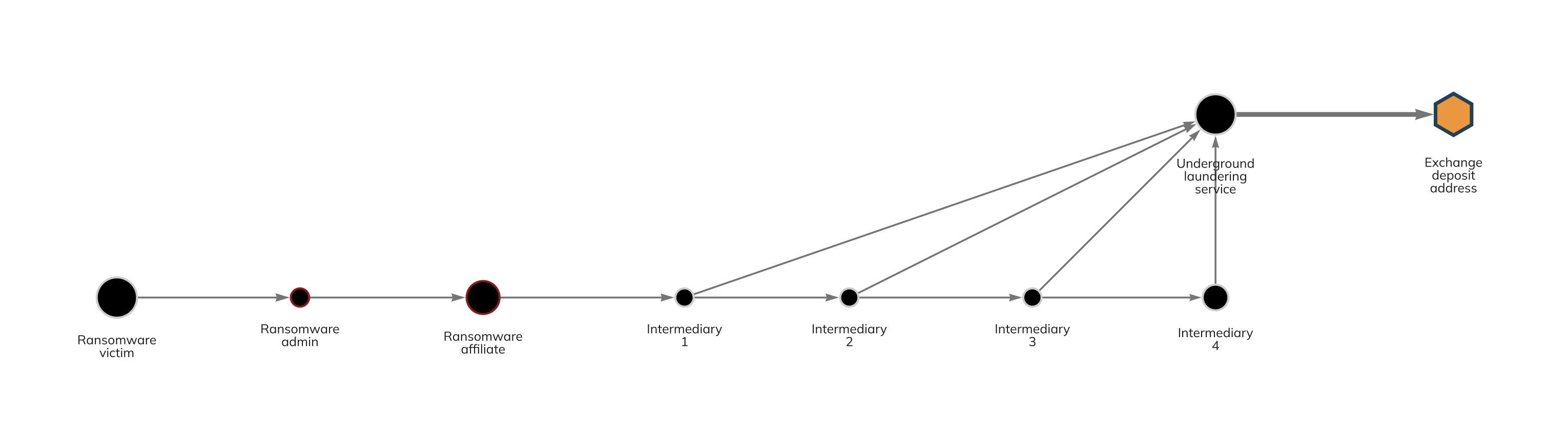 In this case, the underground laundering service, which functions similarly to a mixer, helped an affiliate for a prominent ransomware strain move funds to a deposit address at a large, centralized exchange. The deposit address is believed to be controlled by the laundering service itself.