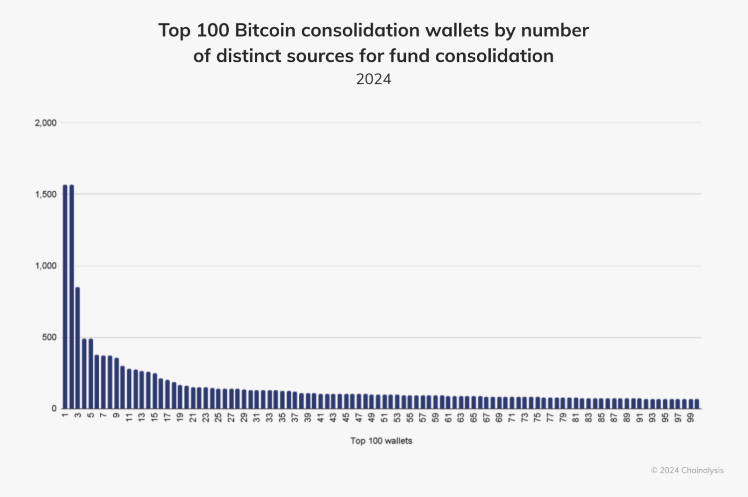 さらに視野を広げると、2024年に総額26億ドル相当のビットコインを受け取った1,500件以上の集約ウォレットを特定できます。これらのウォレットはそれぞれ、少なくとも10件の異なるウォレットから資金を取得しています。ただ、繰り返しになりますが、このパターンだけでは違法資金のマネーロンダリングと断言することはできません。実際は合法的な資金の流れである可能性もあります。とはいえ、このようなパターンには留意しておくべきでしょう。