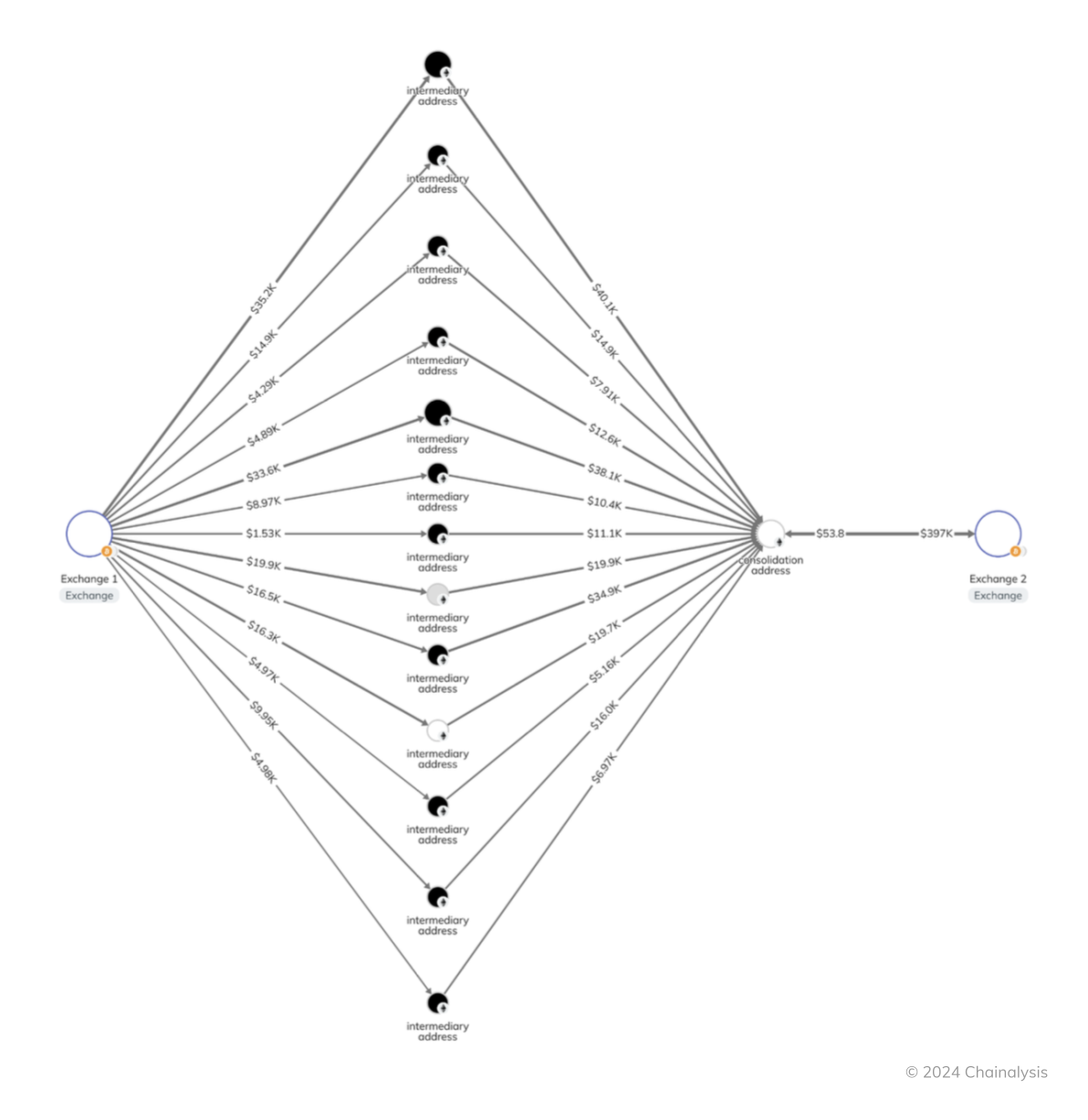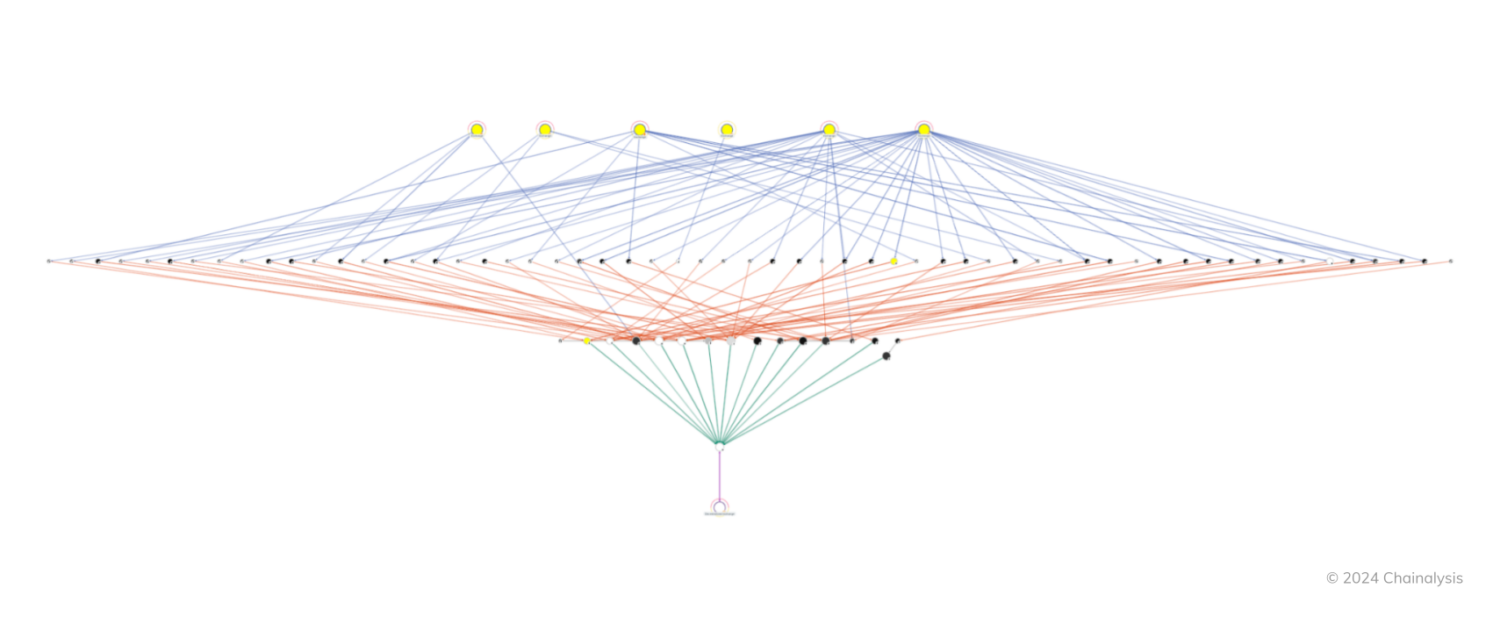 上記の例は比較的単純ですが、より複雑なマネーロンダリングネットワークでは、数十、あるいは数百もの中間ウォレットから資金を集約するウォレットが存在します。Chainalysisのデータを照会することで、主要な統合ウォレットを特定でき、それが有力な手掛かりとなることはよくあります。例えば、今年に入ってから現在までに、(すべて取引所から2ホップ離れた場所でトランザクションを行っている)2024年のビットコインの集約ウォレットの上位100件には、14,970件以上の異なるアドレスから9億6800万ドル相当のビットコインが送金されています。