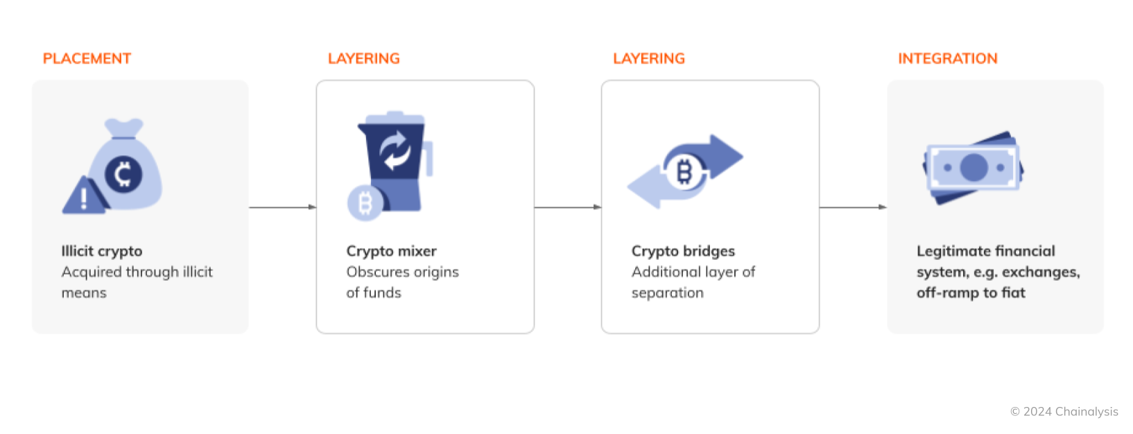 暗号資産で直接取得した資金の洗浄プロセスは、サイバー犯罪者がさまざまなサービスを利用して資金の出所や動きを隠ぺいするため、高度なものであることがよくあります。暗号資産に関するツールの深く理解することは、暗号資産事業者や法執行機関にとって永続的な課題となっています。