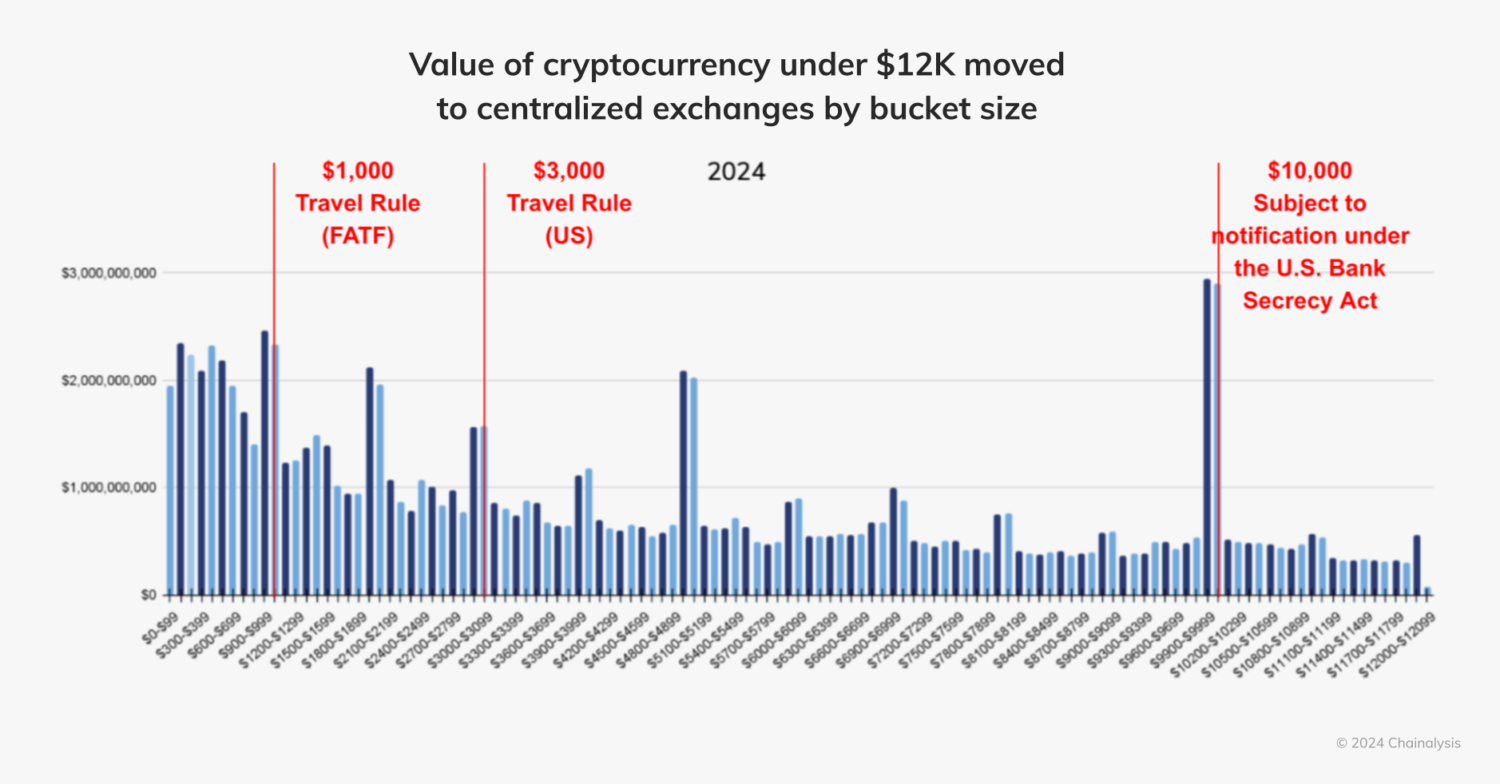 暗号資産ネイティブではないマネーロンダリングを特定する方法のひとつとして、報告基準額ギリギリの金額を何度も送金するパターンを検知するという方法があります。この点については、当社の2024 Crypto Money Laundering Reportで詳しく説明しています。この基準額は国によって異なりますが、FATF (金融活動作業部会) は、1,000米ドル/ユーロを超える暗号資産トランザクションはトラベルルールの対象とするよう勧告しており、アメリカではこの基準額は3,000米ドルと定められています。さらに、米国銀行秘密保護法(BSA)では、1万ドルを超える現金取引の報告を義務付けています。つまり、このような金額を超えるトランザクションは追加の精査の対象となりますが、これらの基準額を下回るトランザクションは、たとえ1ドルでも同レベルの検査を受けることはありません。
