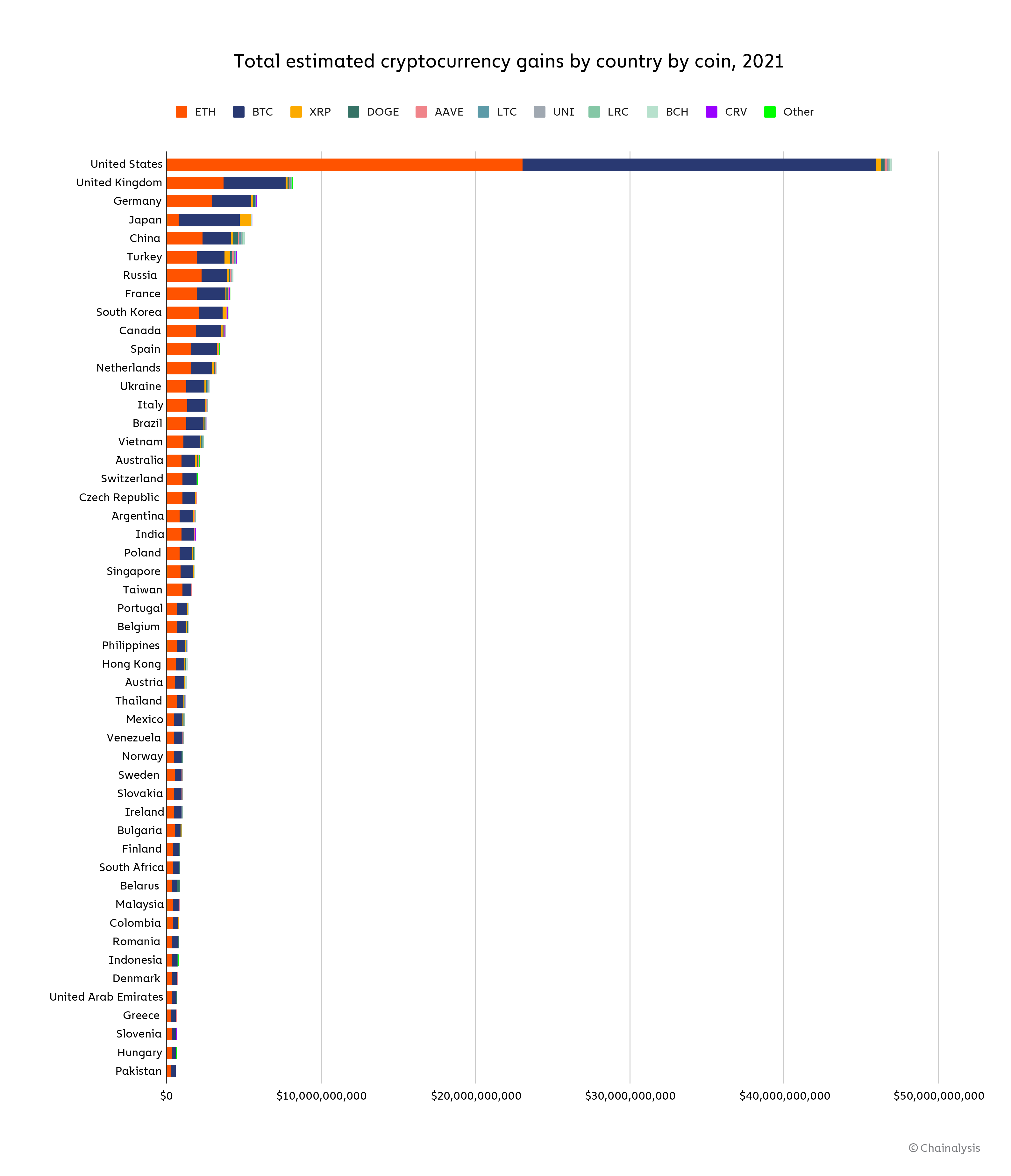 Overall, across all cryptocurrencies Chainalysis tracks, investors around the world realized total gains of $162.7 billion in 2021, compared to just $32.5 billion in 2020. The graph below shows the top 50 countries accounting for those gains.