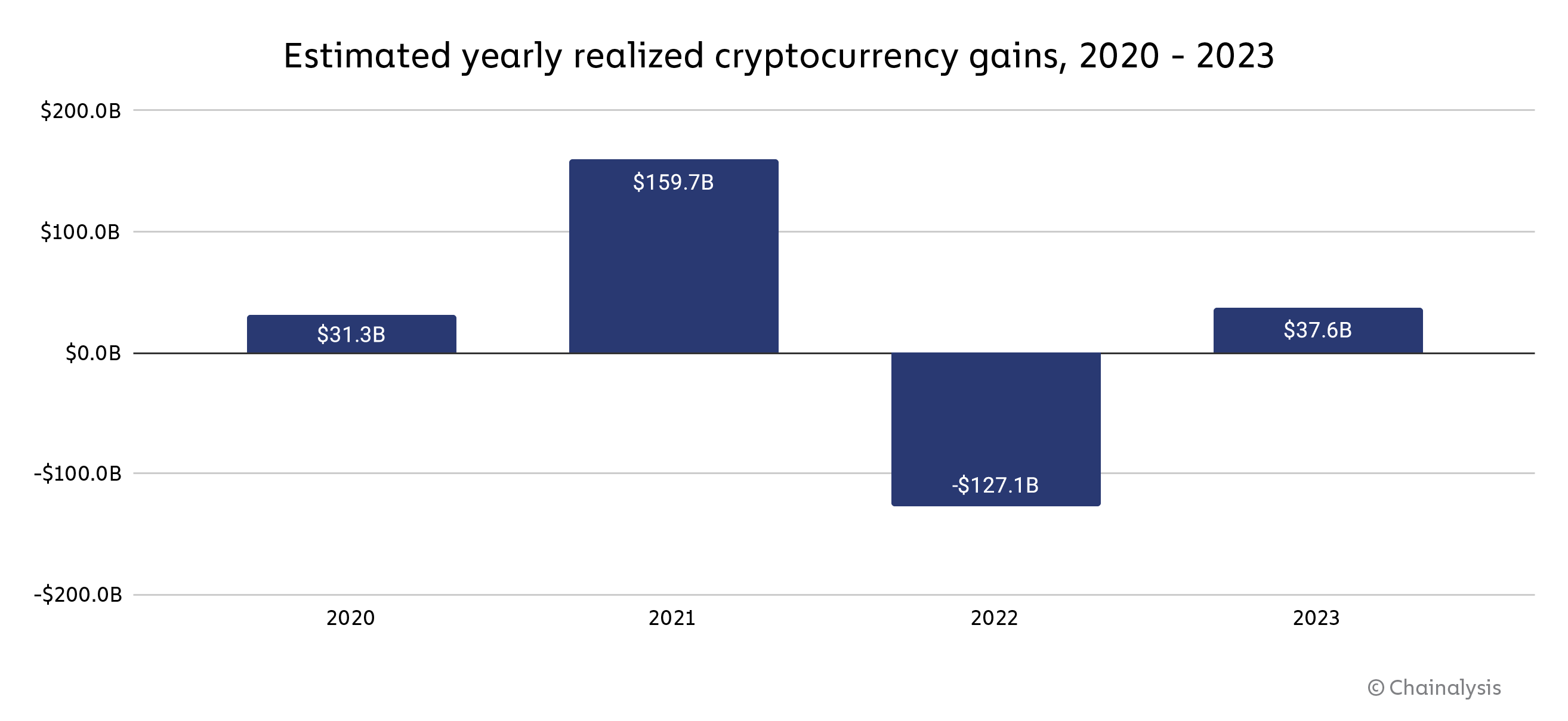 Overall, we estimate that all crypto investors achieved total gains of $37.6 billion in 2023.