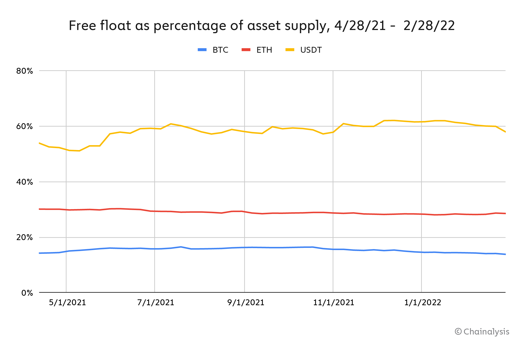 In short, free float is designed to measure the value of an asset held by entities that are likely to circulate that asset based on their previous behavior. Please note that entities here can mean both private wallets and services like exchanges — all that matters is that they meet our criteria above. Below, we compare the three cryptocurrencies with the biggest market capitalizations by total supply and percent of all value in free float.