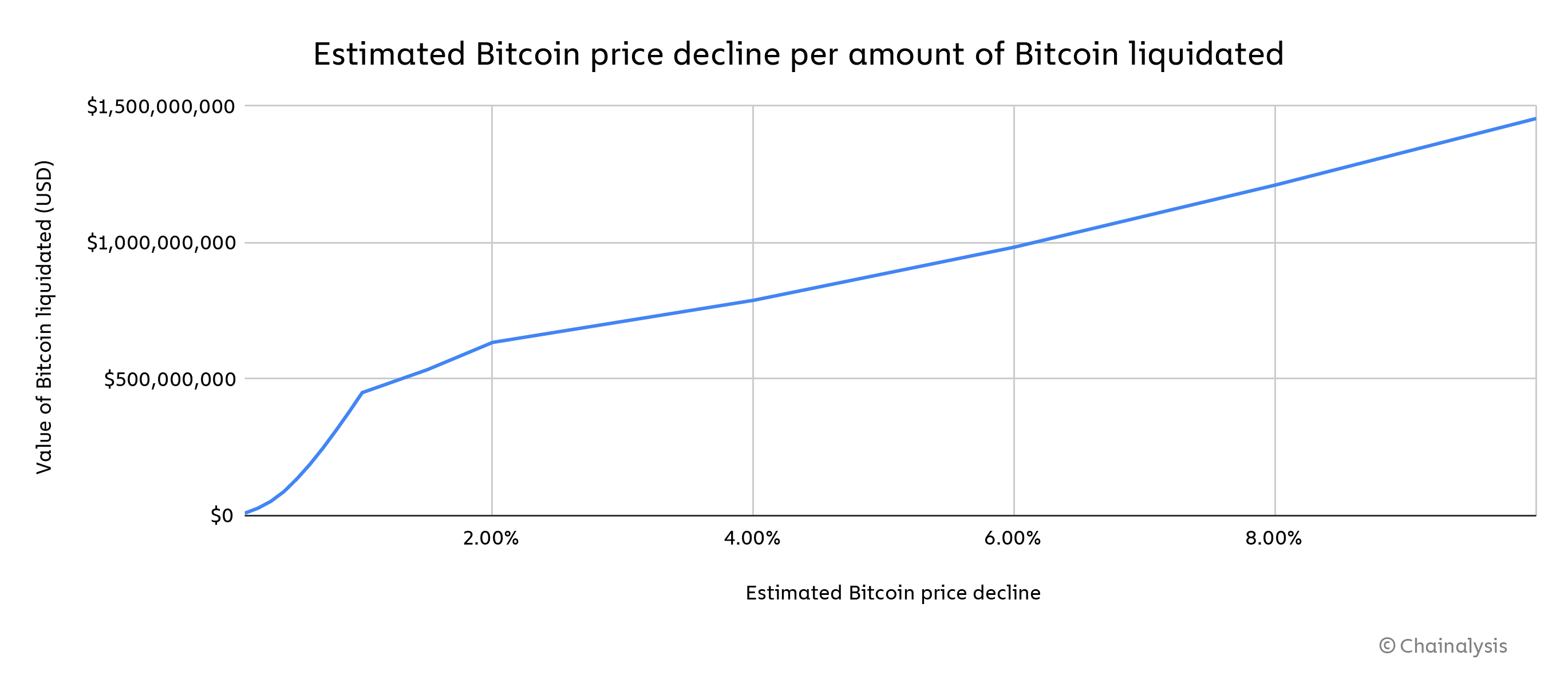 Overall, these three assets offer a combined $296 billion in free floating supply that we can expect the holder, based on past behavior, to move within a given year-long period — less than half of the estimated $800 billion held by Russian oligarchs. Furthermore, under these conditions, we would expect any attempt to liquidate billions of dollars’ worth of cryptocurrency to apply significant downward price pressure. Our models, based on an analysis of liquidations — that is, exchanges of Bitcoin for fiat currency — and subsequent price movements across 19 exchanges, estimate that Bitcoin’s price would decrease by 10% after the sale of just $1.46 billion worth of Bitcoin.