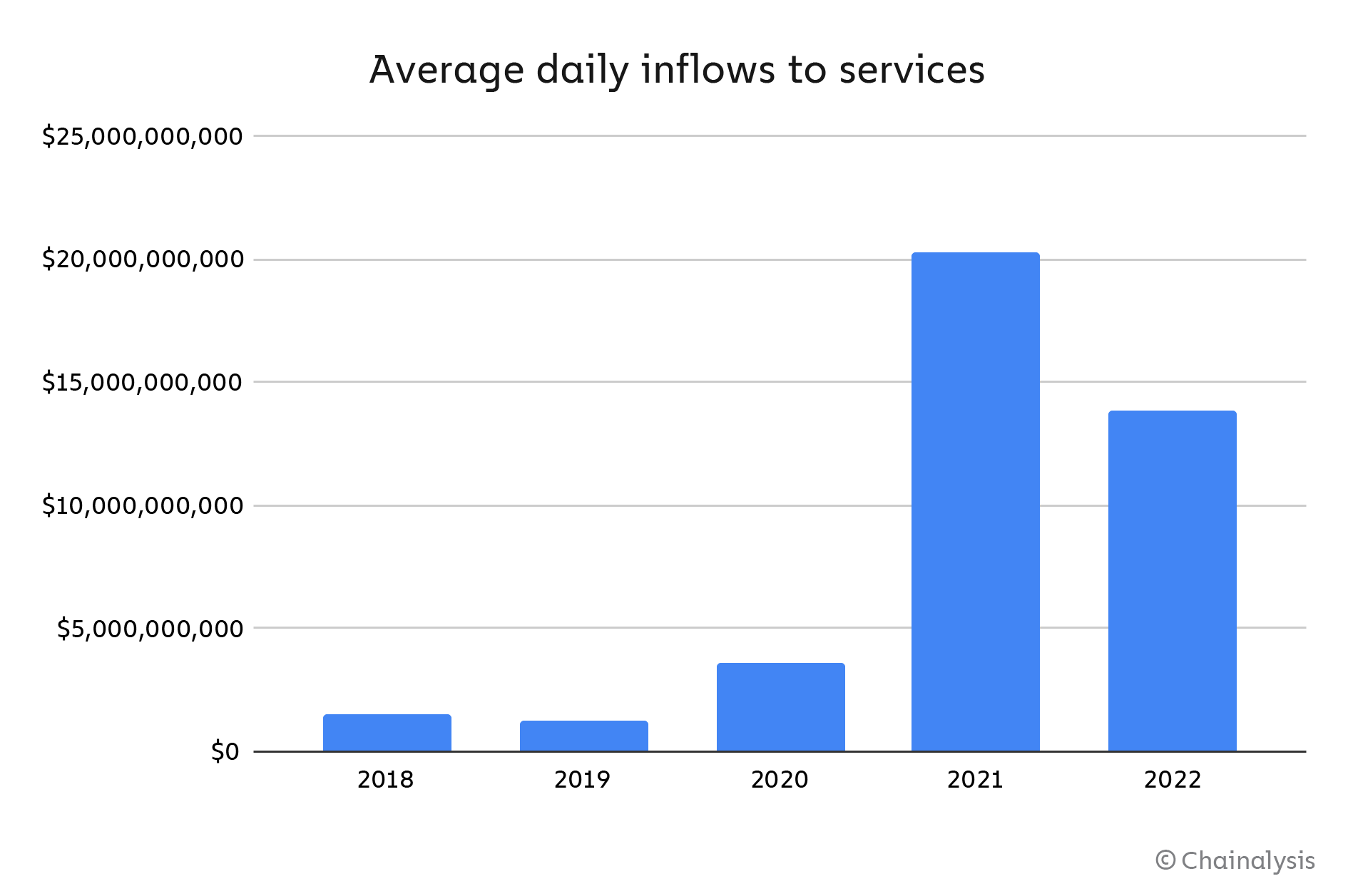 On average in 2022, we’re seeing roughly $14 billion worth of cryptocurrency flow into cryptocurrency services every day, down from $20 billion in 2021.