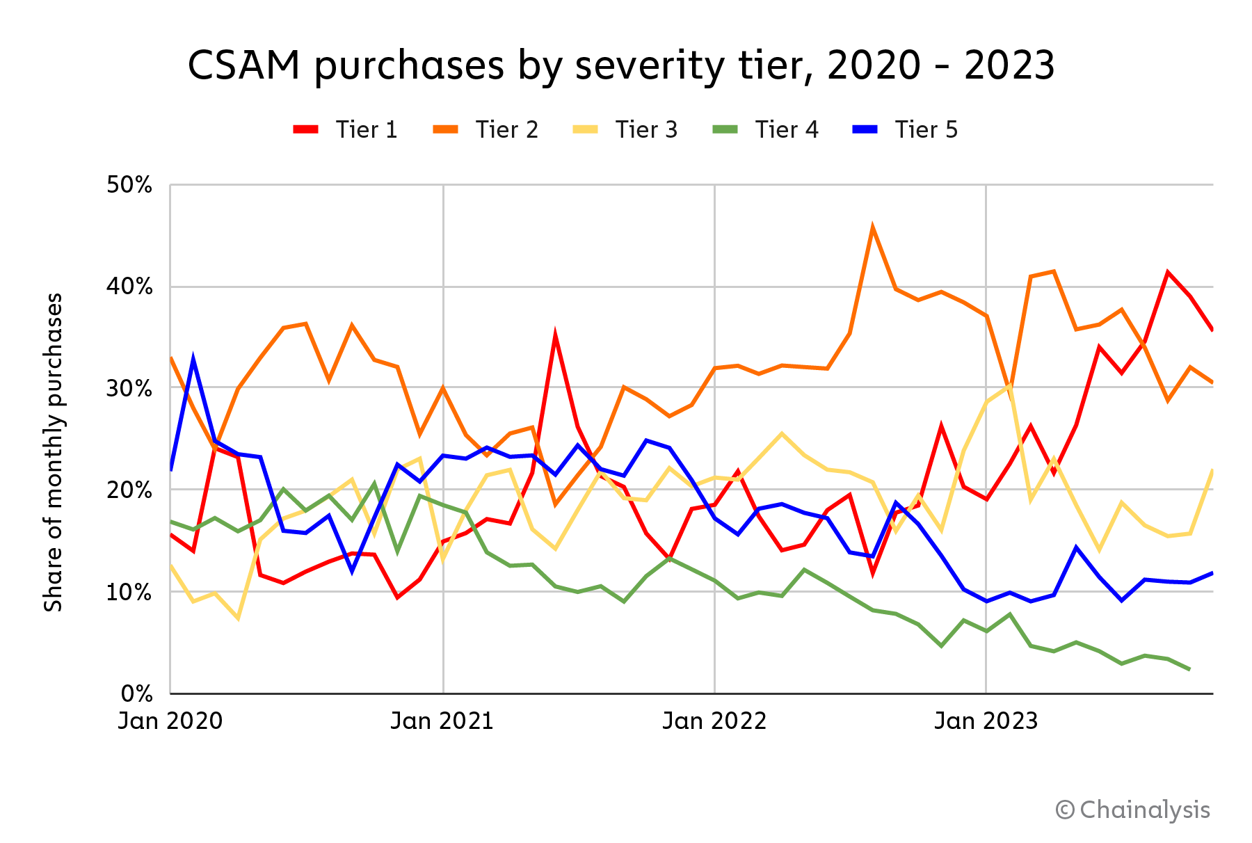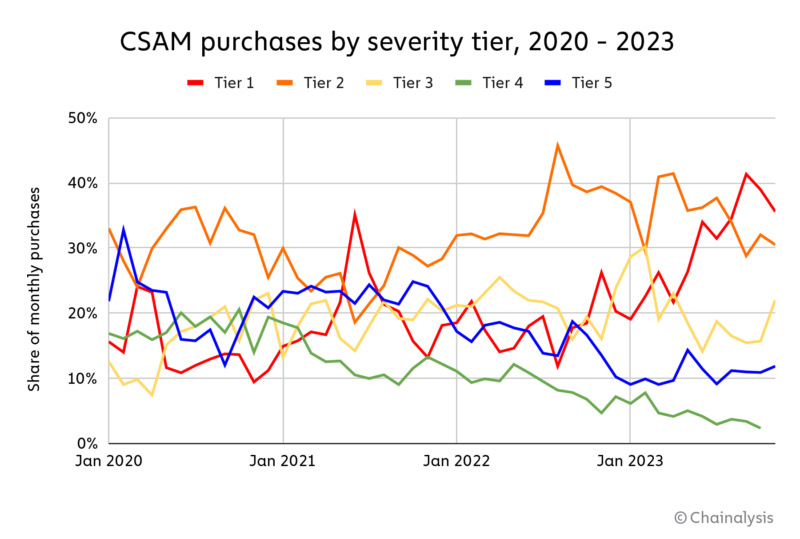 As we can see on the chart below, purchases in Tiers 4 and 5 have decreased as a share of overall CSAM transactions over time since 2021, while the share for Tiers 1 and 2 has increased.