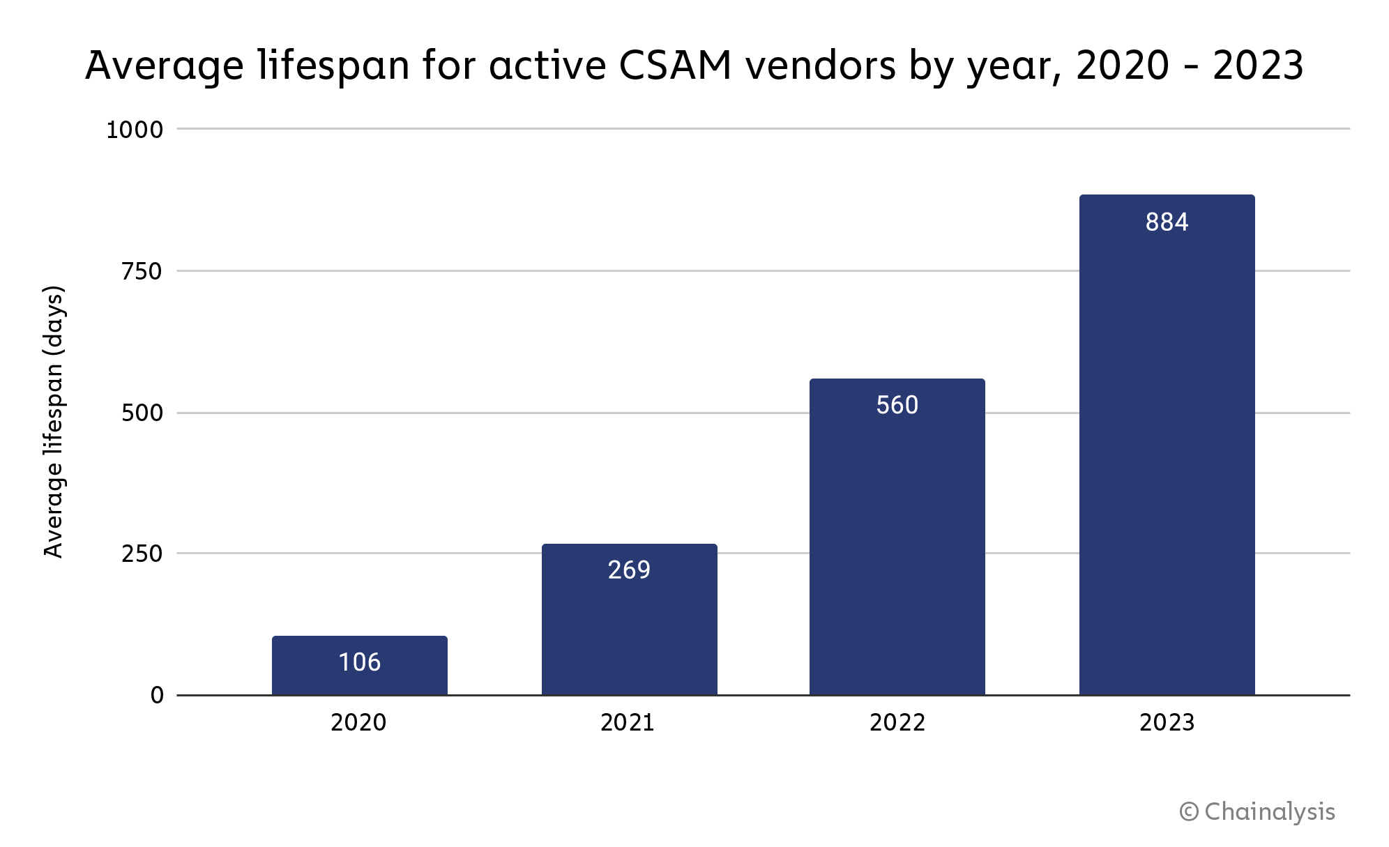 Lifespans are trending upwards: In 2023, the lifespan of the average active CSAM vendor is 884 days, up from 560 days in 2022. However, relatively few new CSAM vendors have cropped up in 2023 — just 43, compared to 112 in 2022. Still, how is it that so many CSAM vendors are able to persist for so long, and why is resilience going up?