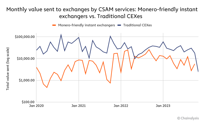 It’s also possible that CSAM vendors are swapping into other cryptocurrencies, including privacy coins other than Monero. But based on vendors’ specific solicitation of Monero and our own investigations, we believe Monero to be the currency of choice for laundering via instant exchangers.