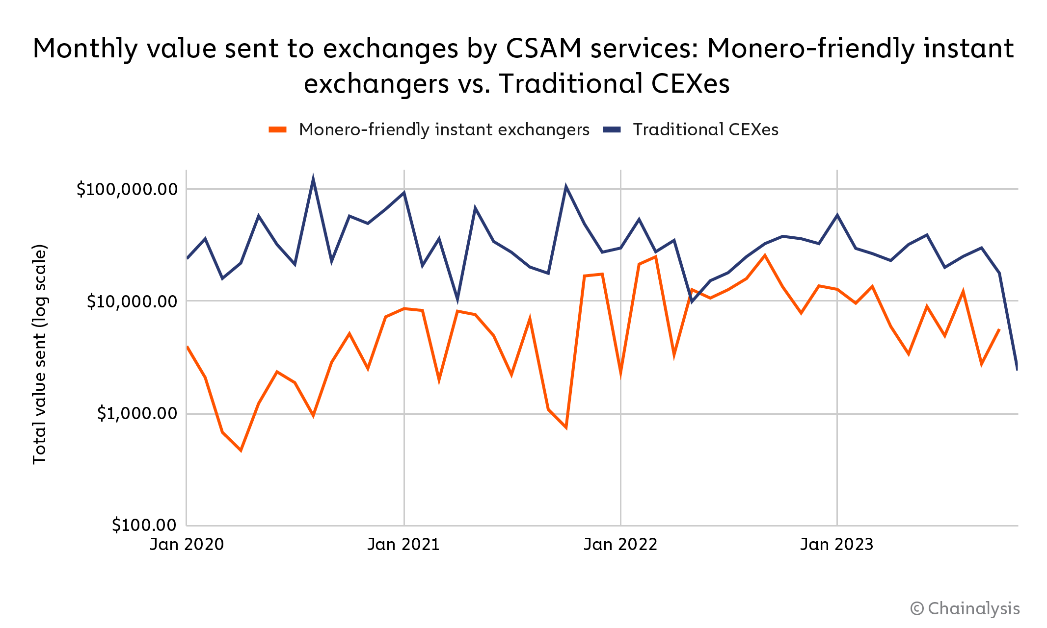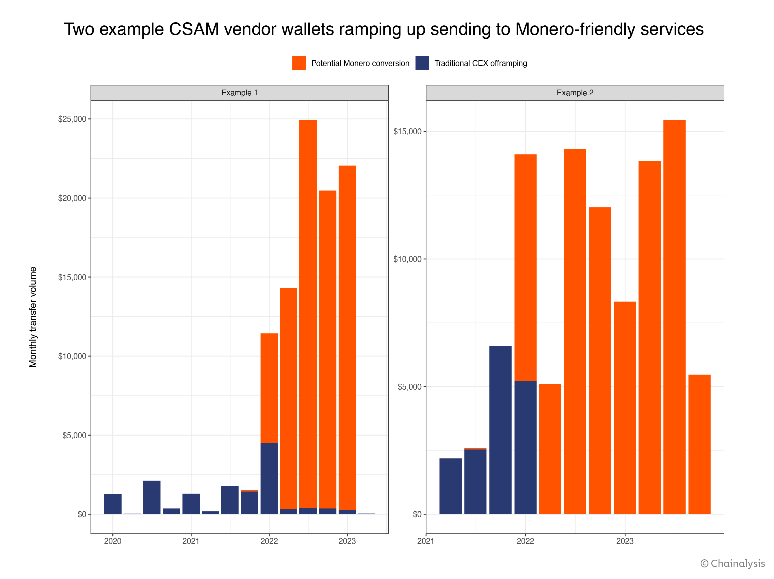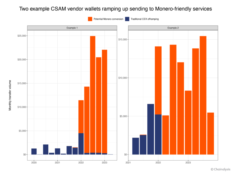 First, we debut a methodology for measuring the scope of the crypto-based CSAM ecosystem across a number of different variables, based on on-chain activity. Overall, our data suggests that while the size of the crypto-based CSAM market has decreased in 2023, the sophistication of CSAM sellers and in turn their resilience to detection and takedowns has increased over time. In addition, we’ll look at CSAM vendors’ use of obfuscation measures such as mixers and privacy coins like Monero, and examine how vendors may benefit from them.