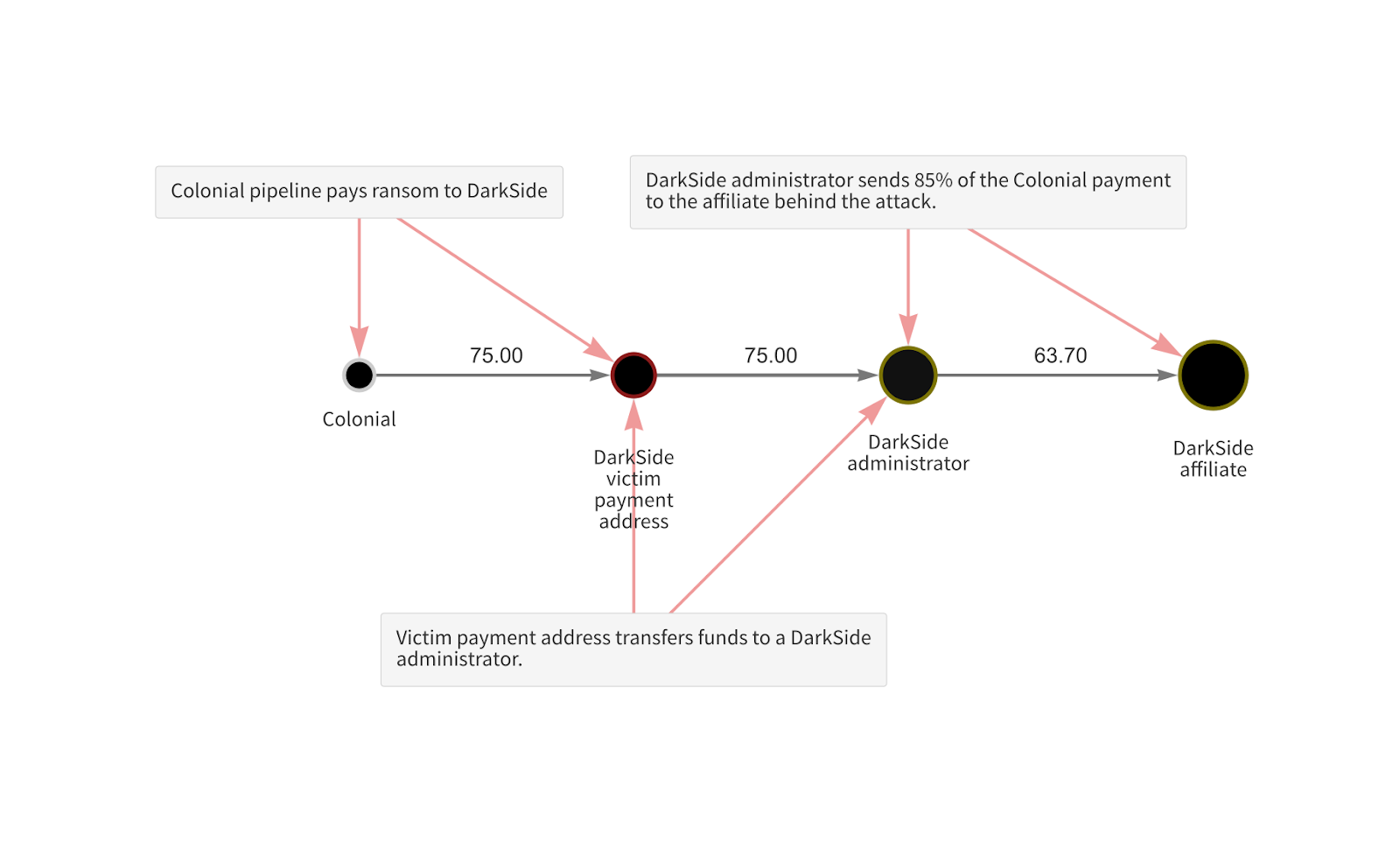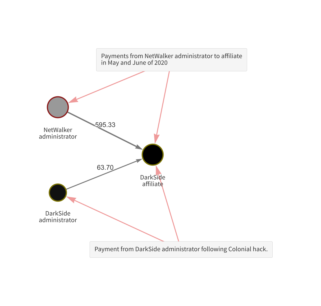 First, on the left, we see the initial payment of 75 Bitcoin from Colonial to the address provided by the attackers. Soon after, that address transferred the funds to an address controlled by DarkSide’s administrators, who then sent 63.7 Bitcoin — 85% of Colonial’s payment — to the affiliate who controlled the attack. That point is key — DarkSide operates on the Ransomware as a Service (RaaS) model, meaning the affiliates who carry out the attack effectively “rent” usage of DarkSide’s technology from the core group of administrators who created and manage the ransomware strain itself. Administrators take a small cut of the payment from each successful attack in return, as we see above.