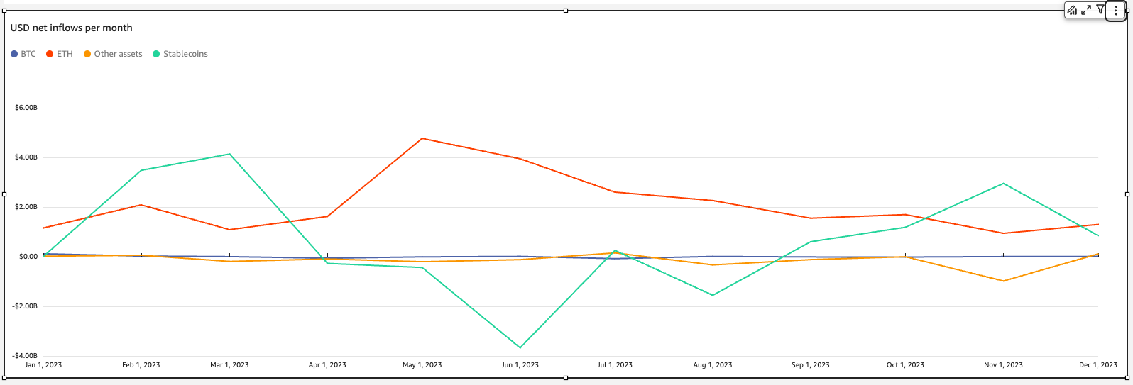 For example, let’s look at DEXs and DeFi net inflow activity over the past year (January 1st, 2023 – December 31st 2023) compared with CExs and other services. We observe just how consistently the DEX and DeFi category received the most value, with February and March representing a distinct peak of inflows for the sector.