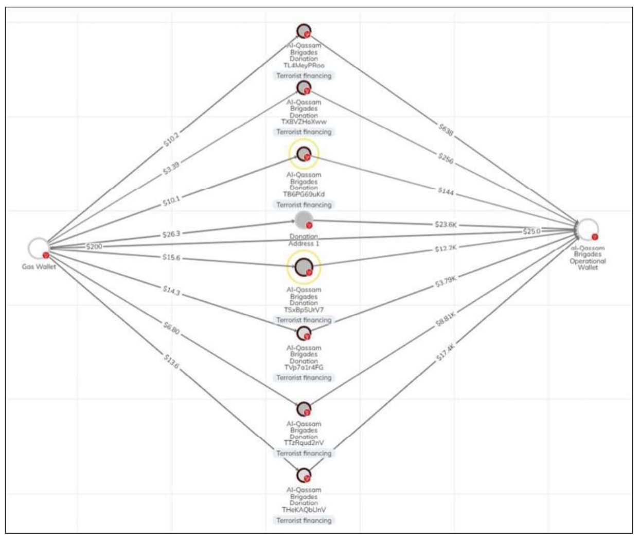 The following Chainalysis Reactor graph, which was shared in the seizure, highlights that law enforcement identified the connection to a gas funding address which was used to facilitate payment of transaction fees in order to fund the movement of payments from their donors to the Hamas operational wallet. Many of these addresses and their remaining balances were provided to the FBI by Binance and Tether, both of whom actively assisted in the seizure.