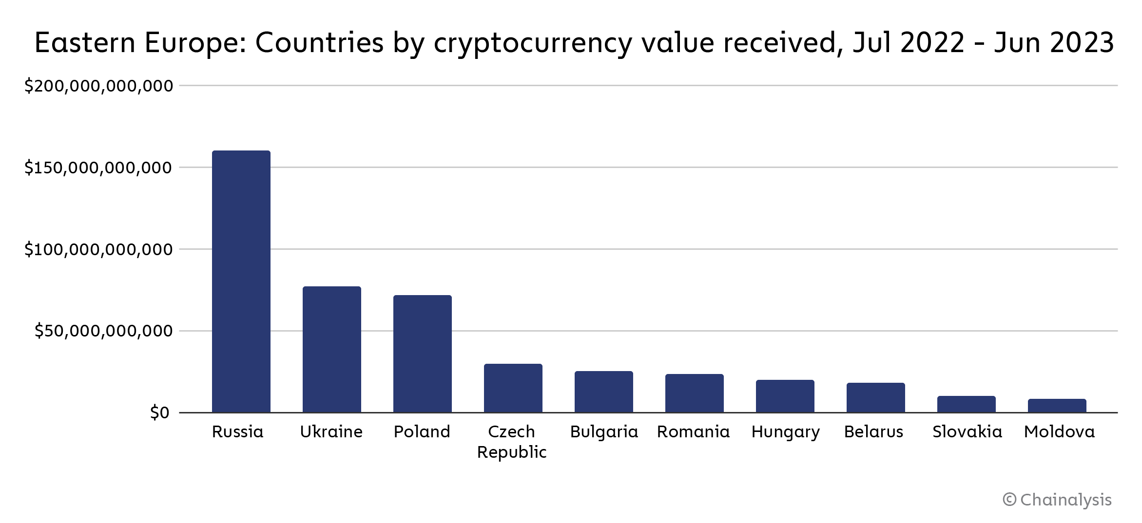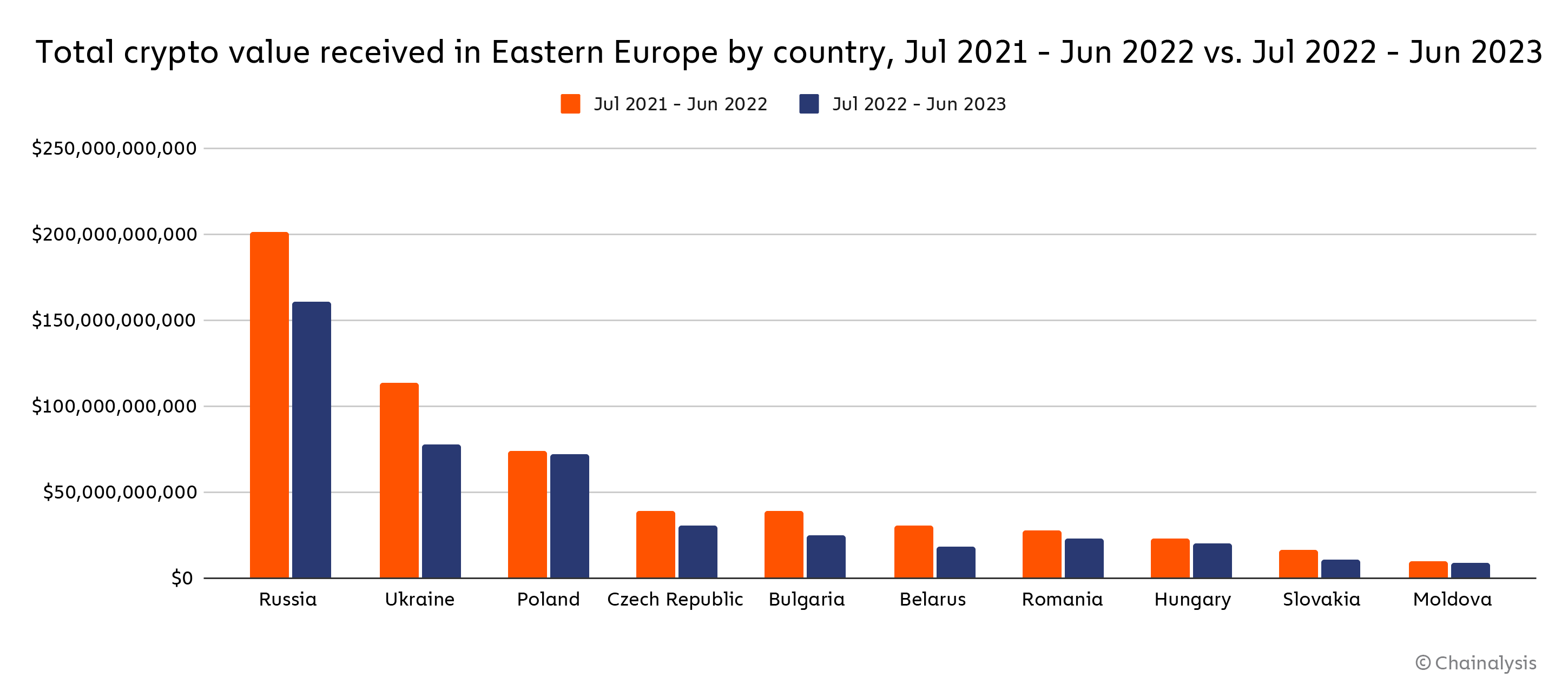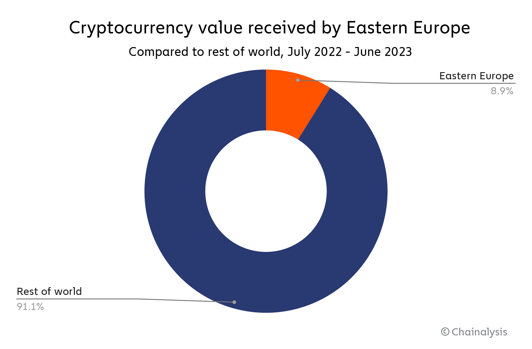 Eastern Europe is the fourth-largest cryptocurrency market we study, with $445 billion in value received on-chain between July 2022 and June 2023. That value represents 8.9% of global transaction activity during the time period studied.