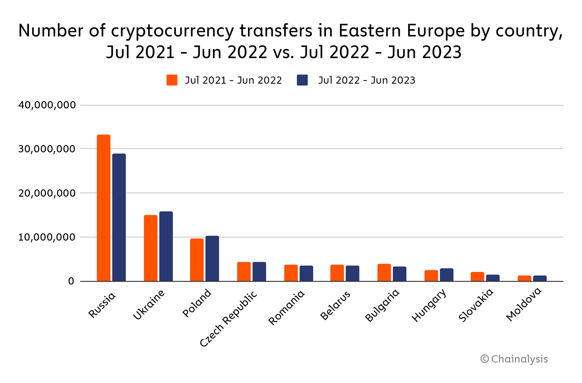 Data on the number of individual crypto transfers, as opposed to just transaction volume, also indicates that crypto usage remains consistent in Eastern Europe. Though Eastern Europe’s transaction volumes have fallen year-over-year, the number of transfers has remained consistent nearly everywhere except for Russia, and has even grown in places like Ukraine and Poland. This suggests that residents of those countries are still using crypto at roughly the same pace.