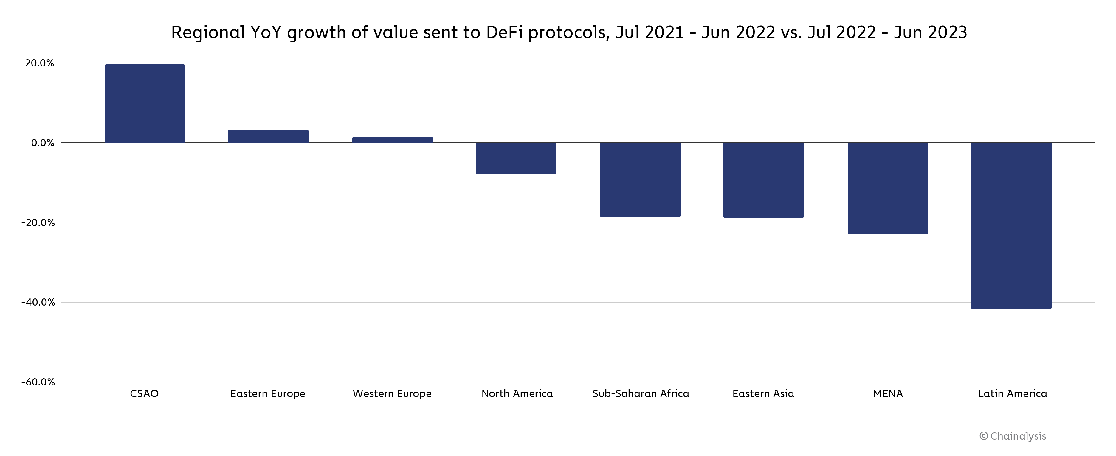 One notable positive trend for the region is in DeFi. Eastern Europe was one of only three regions to see an increase in DeFi activity at 3%.
