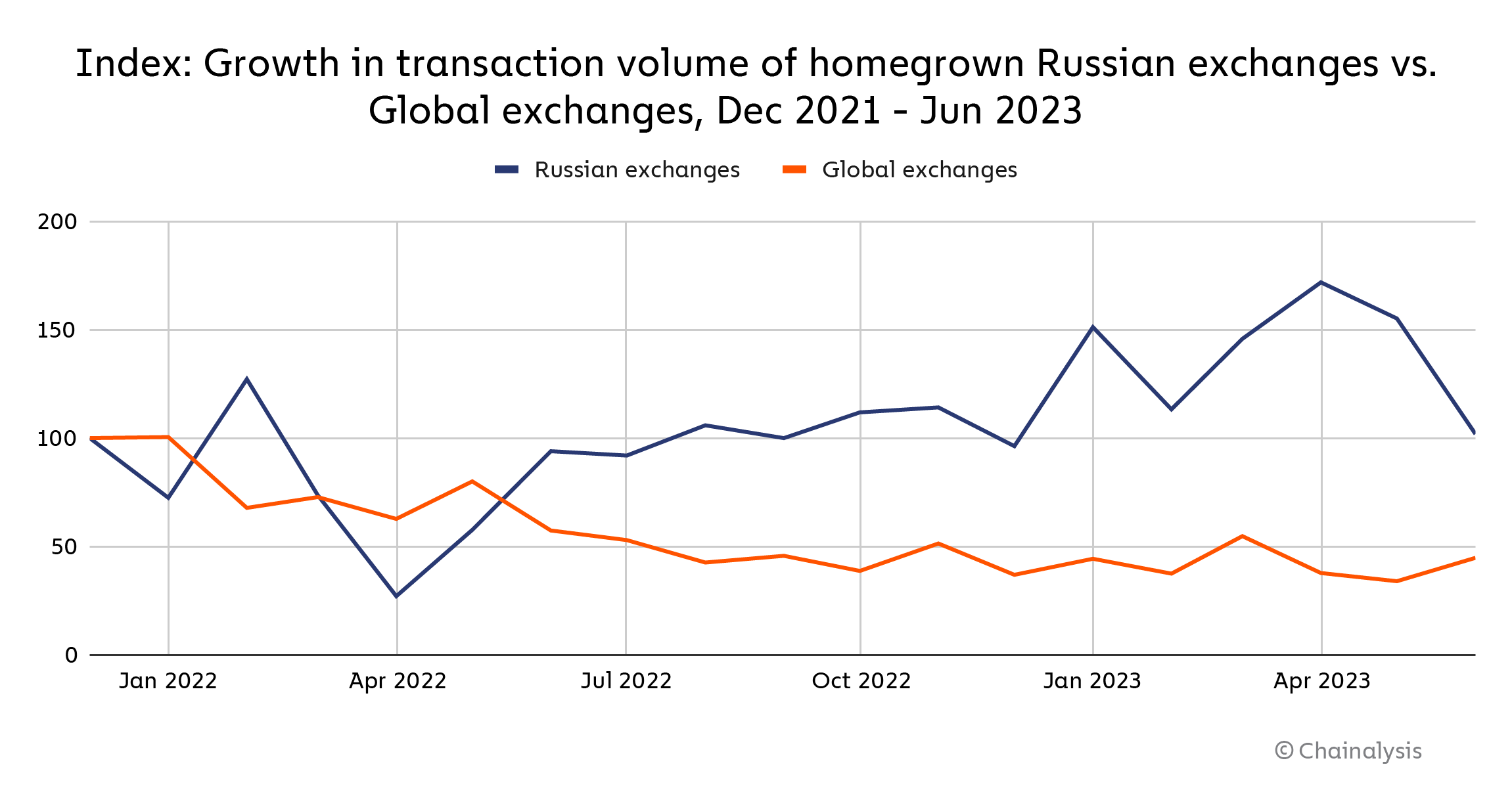 This decline is likely driven by the ongoing war between the two countries, but in different ways. Russia’s decrease is likely driven at least in part by economic sanctions from the United States, the European Commission’s complete crypto ban against Russia last fall, and a general decline in willingness by companies to do business in Russia following the invasion. One piece of evidence is the more than 50% decline in Russian usage of the world’s biggest international exchanges since the months preceding the war, as we see on the index below. That may be in part attributable to restrictions some international exchanges placed on Russian users and banks due to the war. Concurrently, we also see growth in transaction volume on exchanges primarily serving Russia, which aren’t introducing such restrictions.