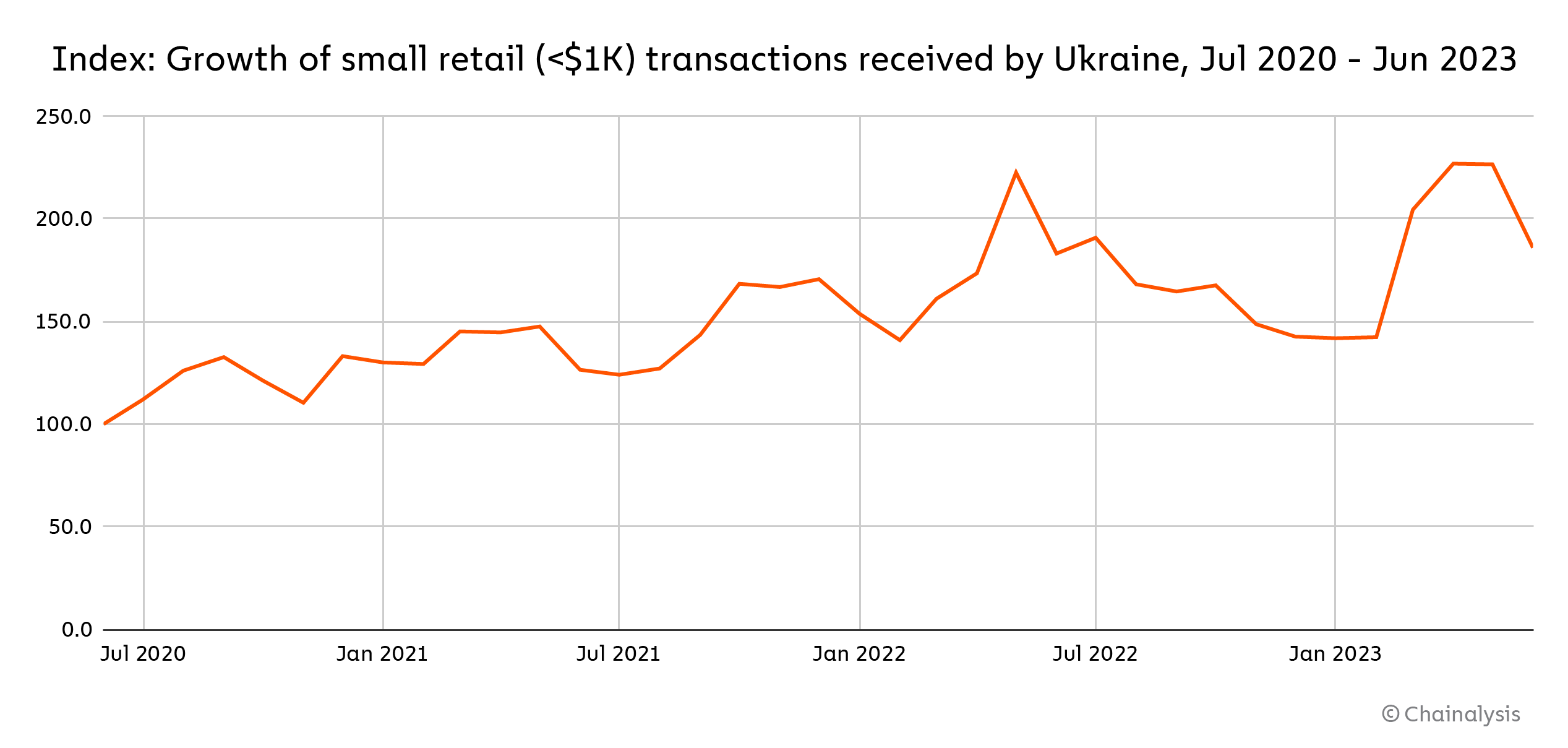 Voievodina said, “Since the Ukrainian economy is going down and towns are being destroyed, people are leaving. Now those Ukrainians living under European legal order are using financial instruments they weren’t using before. People are looking for new options and aren’t afraid of KYC as they used to be.” She explained that those Ukrainians are now using crypto for everyday purposes like savings, making donations, and sending remittances back home. In fact, in the last year we estimate remittances sent to Ukraine rose significantly. The chart below shows a rise in small retail transactions, the amounts of which match the size of payments typically sent for remittances.