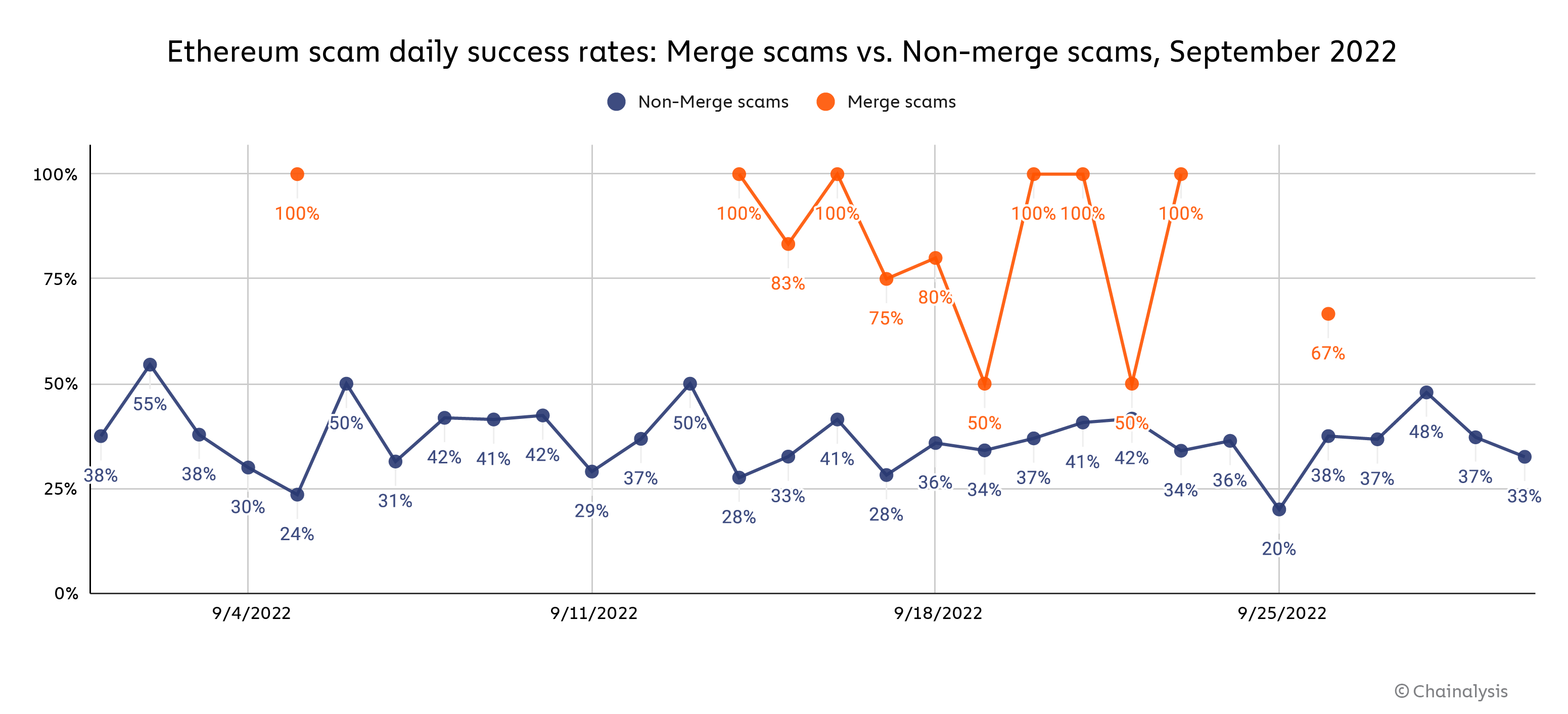 In fact, the data suggests it was hard not to make at least some money if you were running a halfway decent Merge scam on and around September 15. Below, we compare the daily success rate for Merge-related scams compared to all other scams throughout the month of September. We define success by whether or not the scam made $100 or more on a given day that it was active, with active defined as whether the addresses associated with the scam transacted on the day in question. One caveat to this method is that it excludes scams that were active but simply didn’t transact on a given day — the least successful possible scams. But, since our goal here is to compare the performance of Merge-related scams and non-Merge scams, we believe the analysis is still revealing as the success rate for both scam types undercount complete failures.