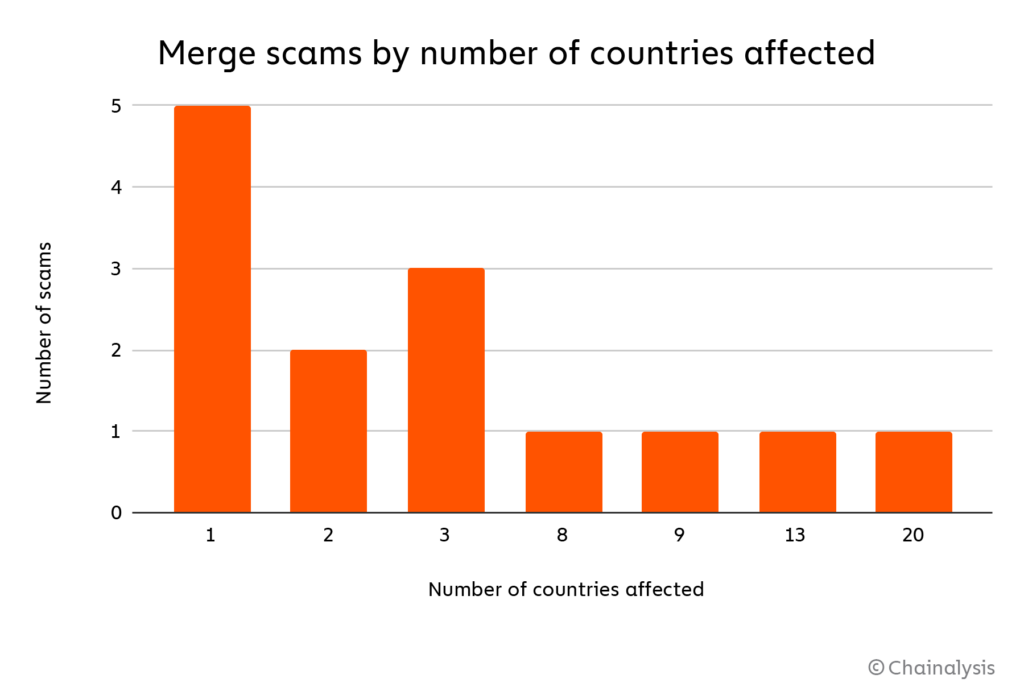 We can also apply our geographic analysis methodology to look at the regional footprint of Merge scams. Overall, most Merge-related scams focused on a limited area, with a plurality receiving payments from users in just one country, and a majority from users in three or fewer countries.