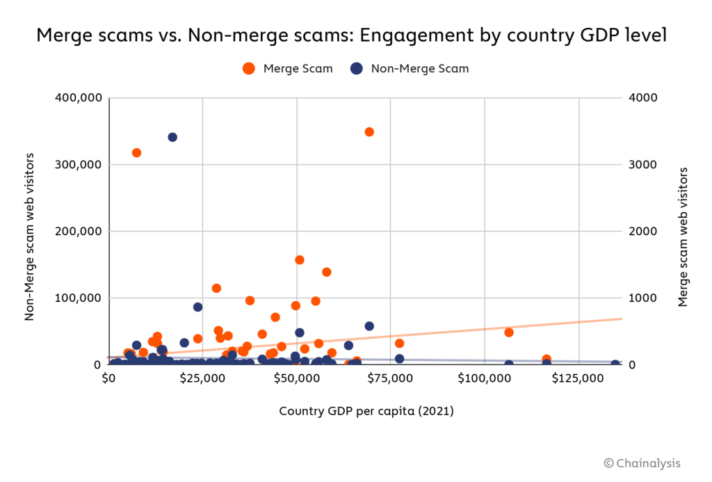 Things get even more interesting in the bottom right quadrant, where we see countries that engaged with Merge scams more than the median country, but comparatively less with Ethereum scams in general. Why might these countries have fallen prey to Merge scams in particular? There are a few potential reasons. Some of the Merge scams we study appear to have targeted those countries specifically. For instance, Finland engaged with Merge scams at a surprisingly high level, but nearly all of that engagement was driven by three scams that only targeted Finland — one of those scams, “buterin-merge[.]com,” received more Finnish engagement than any other Ethereum scam during the month of September. However, other countries engaged with Merge scams that targeted several countries, so some set of additional country-specific features might be at play. One of those features appears to be wealth — scams are all about money, after all.