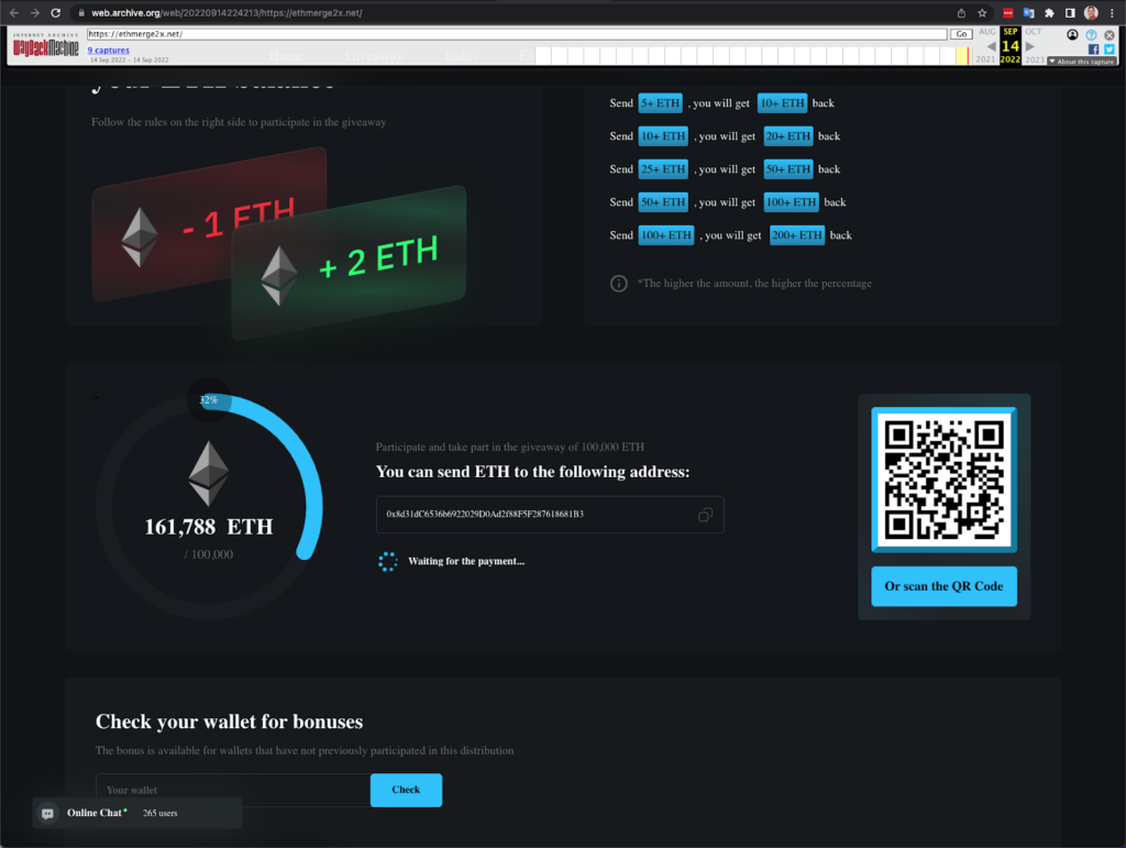 Most Merge scams functioned similarly to the classic trust trade scam, in which the fraudster tells victims to send them some amount of cryptocurrency to receive more in return (typically double the victim’s initial payment), often impersonating celebrities to do so. In this case, scammers told victims they should send in cryptocurrency in order to “upgrade” to the new Ethereum blockchain and receive funds in return.