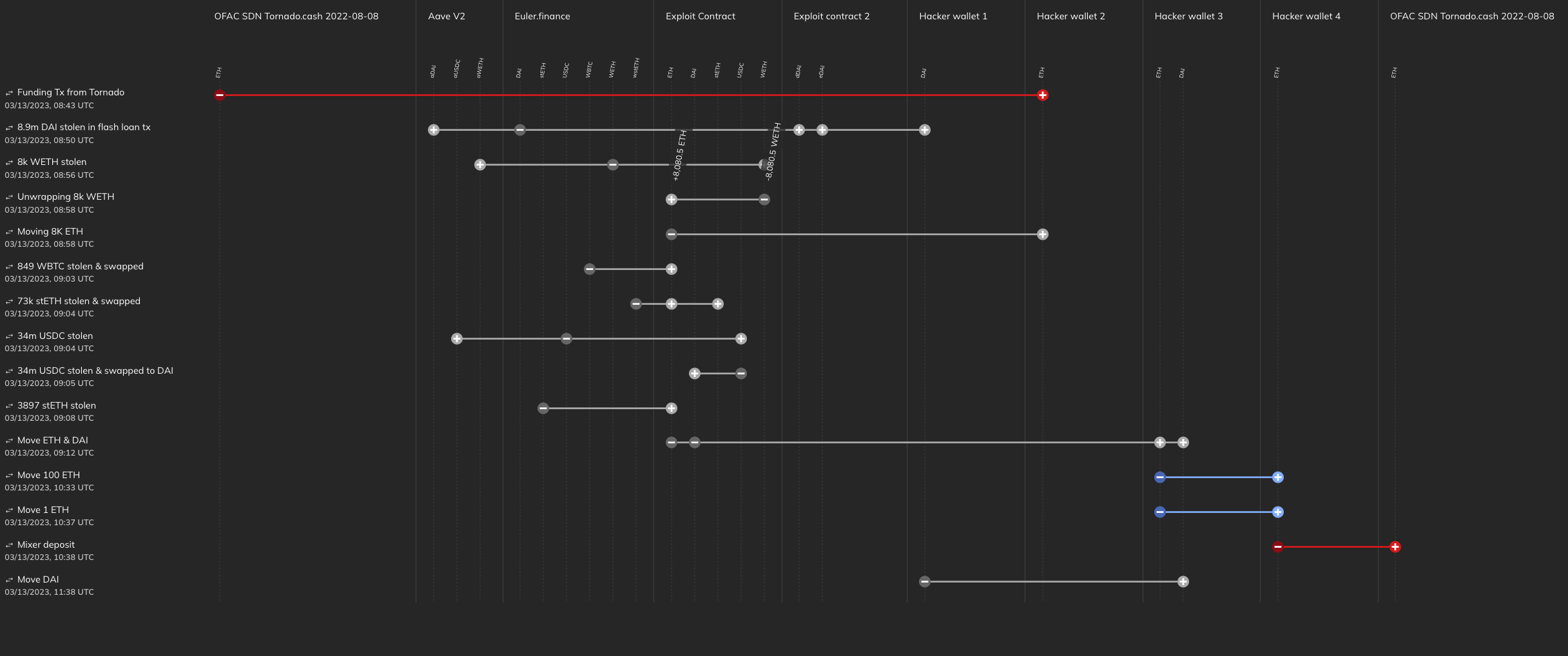 The hacker received initial funding from the sanctioned mixer Tornado Cash for gas fees and to create the contracts used in the exploit, then initiated a flash loan to borrow around $30 million in DAI from the DeFi protocol Aave. After this, the hacker deposited $20 million of that DAI into Euler’s platform, receiving a similar amount in eDAI tokens. By leveraging Euler’s borrowing capabilities, the hacker was able to borrow 10 times the original deposited amount. The hacker then used the remaining $10 million in DAI from the original loan to repay part of the acquired debt (dDAI) and reused the mint function to borrow again until the flash loan was closed. After the hack was complete, the hacker moved some of the funds back to Tornado Cash. Investigators would need to employ advanced investigative techniques like those Chainalysis offers to pursue the funds further.
