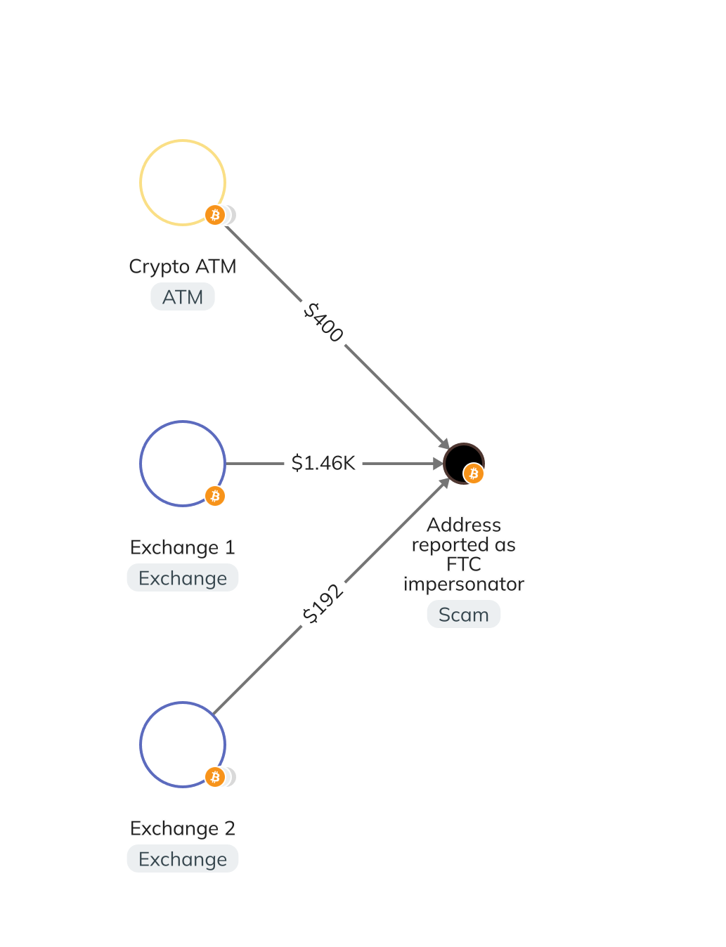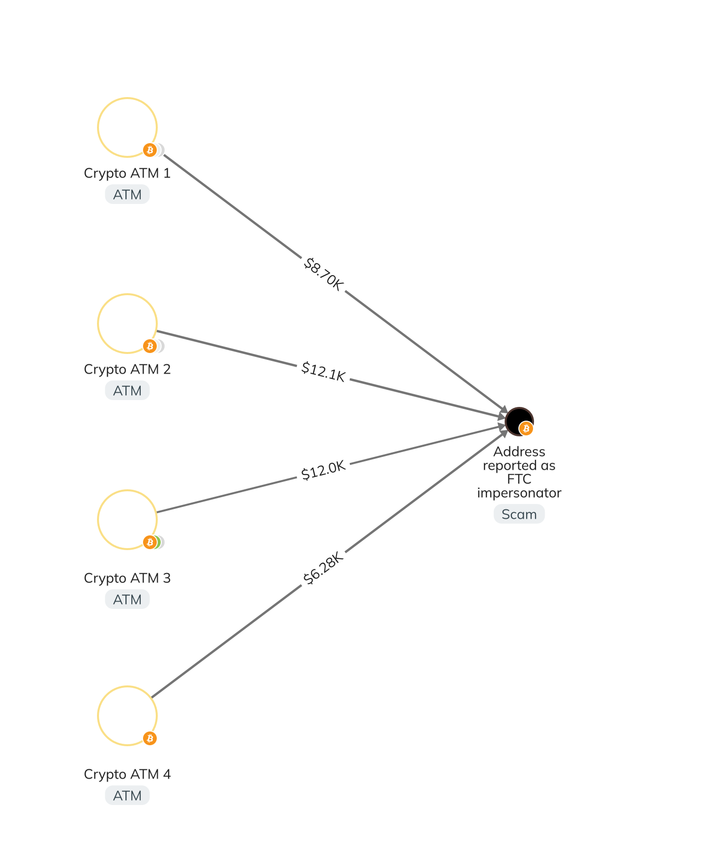 Another factor we examined to determine the likelihood of these addresses belonging to FTC impersonators or a larger scam group is that they received funds from crypto ATMs, which the real FTC identified as a strategy to attract victims. In the below Chainalysis Reactor graph, we see how another address reported to us as an FTC scammer received funds from several crypto ATMs.