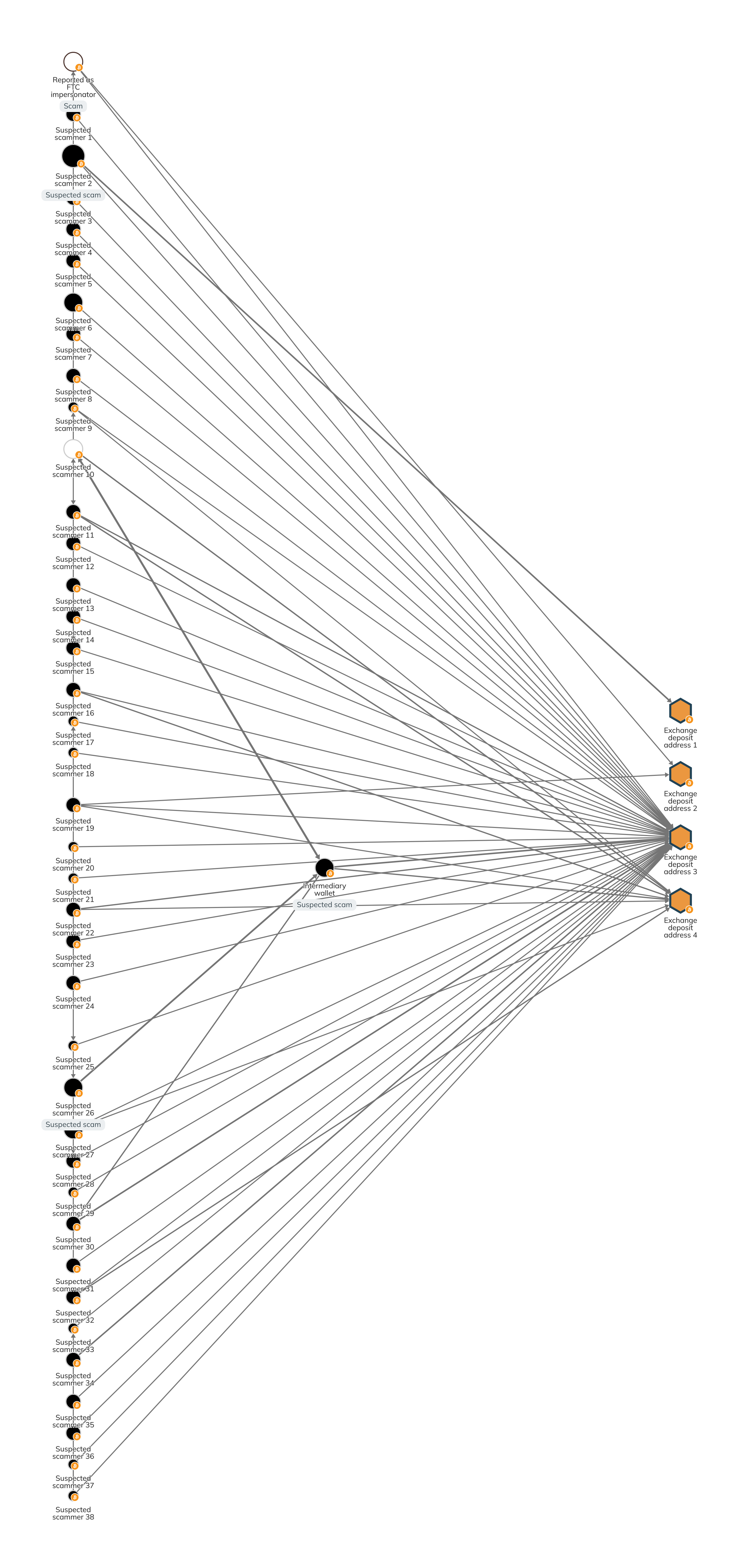 Once we identified the exchange deposit addresses, we were able to look at their receiving exposure, which revealed nearly 40 addresses that behave similarly to the one originally reported by the victim. Given that these addresses have sent funds to the same four exchange deposit addresses, it is likely that they belong to the same scam group sharing crypto wallets or are working with the same money launderer. In total, these addresses represent approximately $1.7 million worth of potential scam activity, illustrating that these losses can be significant, as the real FTC reported.