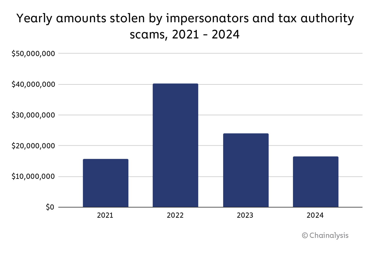 Unfortunately, impersonation scams are on the rise — losses reported to the FTC in 2023 were more than $1 billion. Although most of these impersonators operate using fiat currency, they are increasingly turning to cryptocurrency due to its increased adoption by the consumer population. As we discussed in our 2024 Crypto Crime Report, we estimate that the amount of crypto stolen by impersonators and tax authority scams was approximately $24 million in 2023. In 2024, we estimate that the total amount stolen is nearly $17 million as of April 2024.