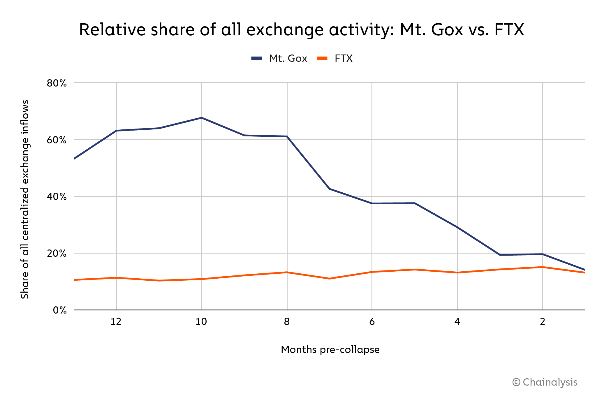 Put simply, Mt. Gox was becoming one exchange among many during a period of growth for the category, taking a smaller share of a bigger pie. FTX on the other hand was taking a bigger share of a shrinking pie, beating out other exchanges even as its raw transaction volume declined.