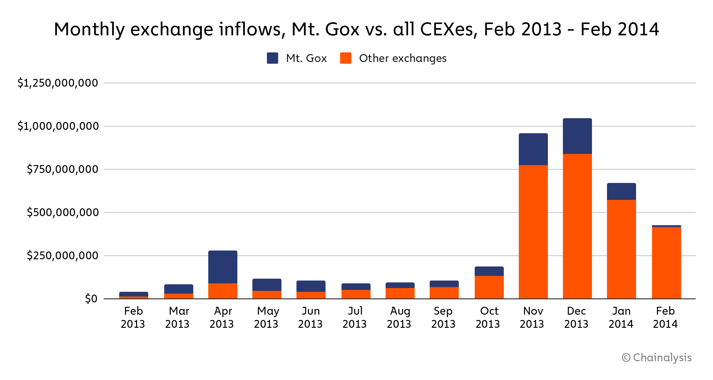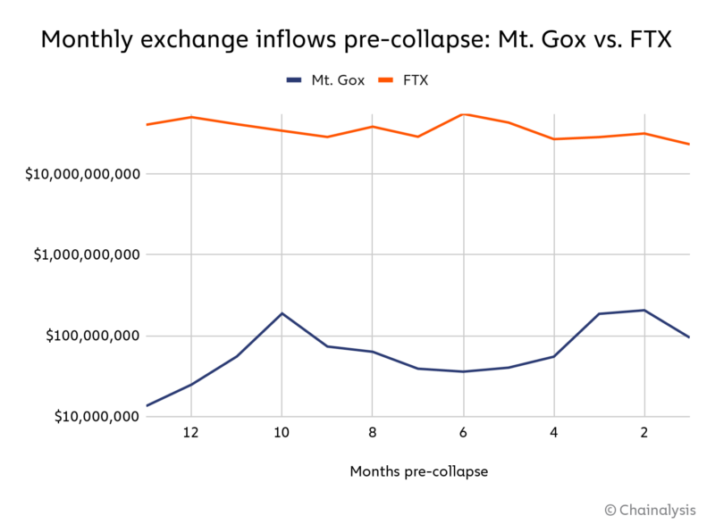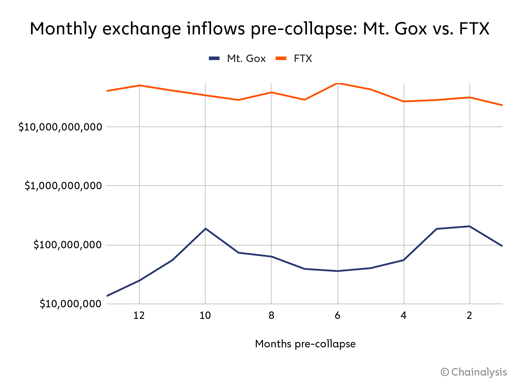 We can see that Mt. Gox was steadily declining in its share of overall exchange activity in the leadup to its collapse, while FTX was slowly gaining in share leading up to Nov 2022. That would suggest FTX’s collapse may be a bigger blow to the industry’s confidence – it was a successful business gaining in market share! But the story changes if we look at raw dollar inflows over time. On this measure, Mt. Gox’s volumes were increasing, while FTX’s were decreasing.