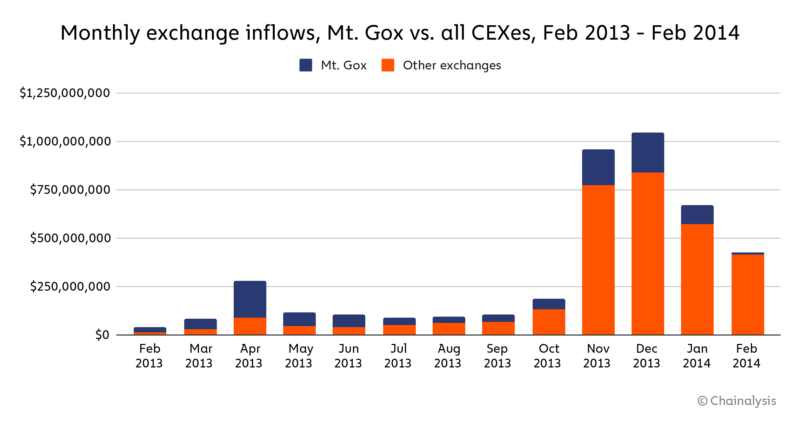 On-chain transaction volume stagnated for roughly a year following Mt. Gox’s collapse, but after that, picked up again and was soon more than double its pre-crisis levels.