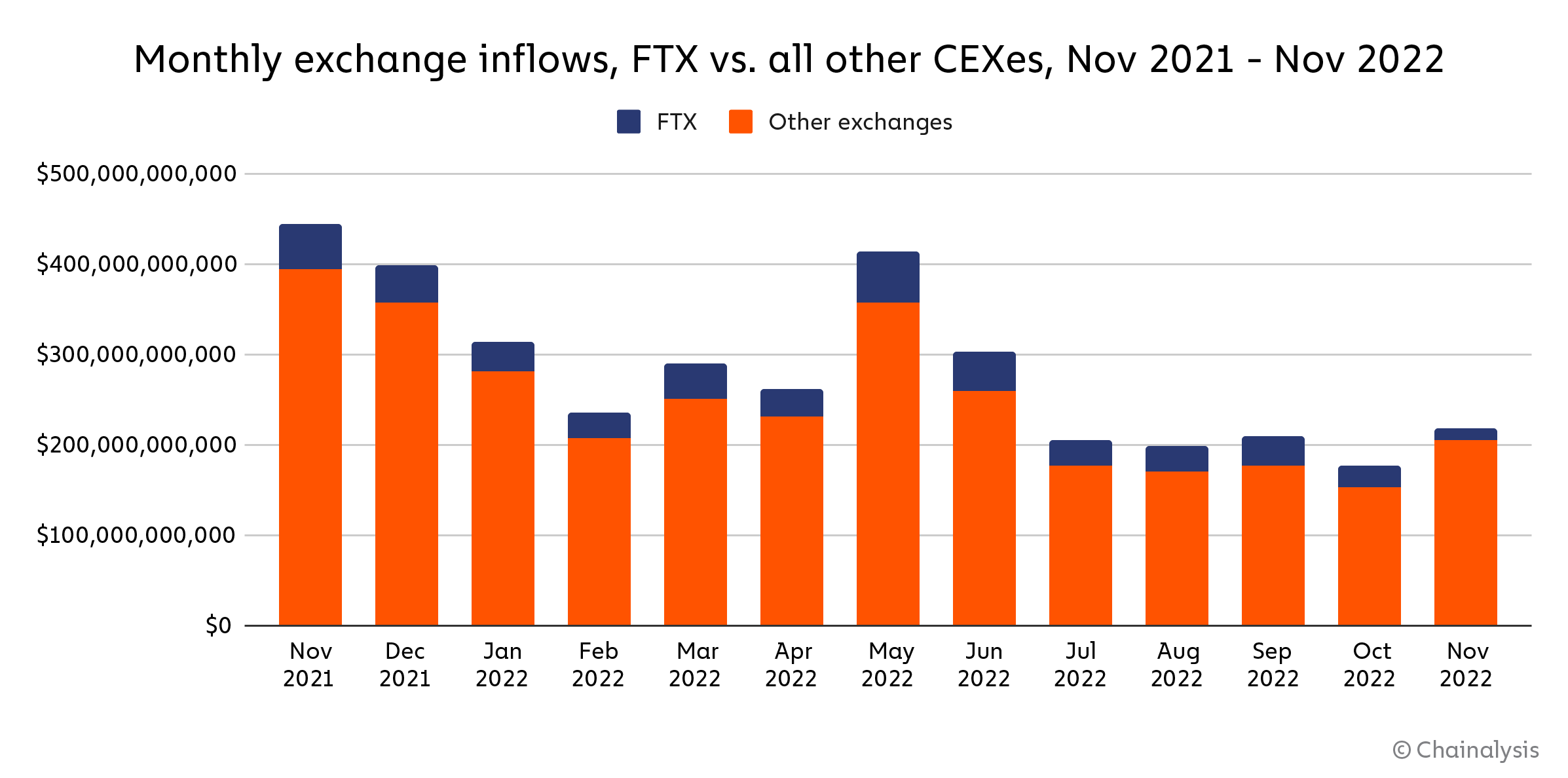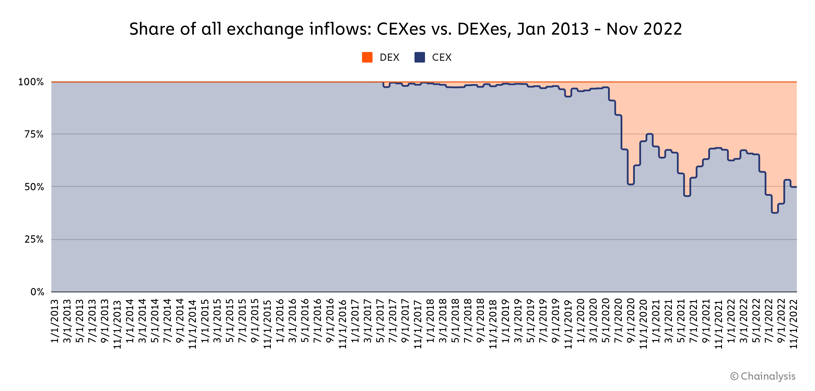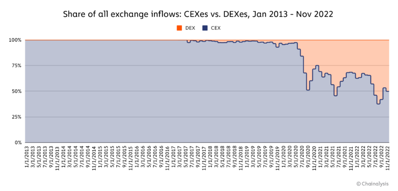 Of course, one big difference between 2014 and now is that there are more crypto services facilitating economic activity than just centralized exchanges. As of late 2022, DEXes are capturing nearly 50% of exchange inflows, while CEXes were the only game in town in 2014.