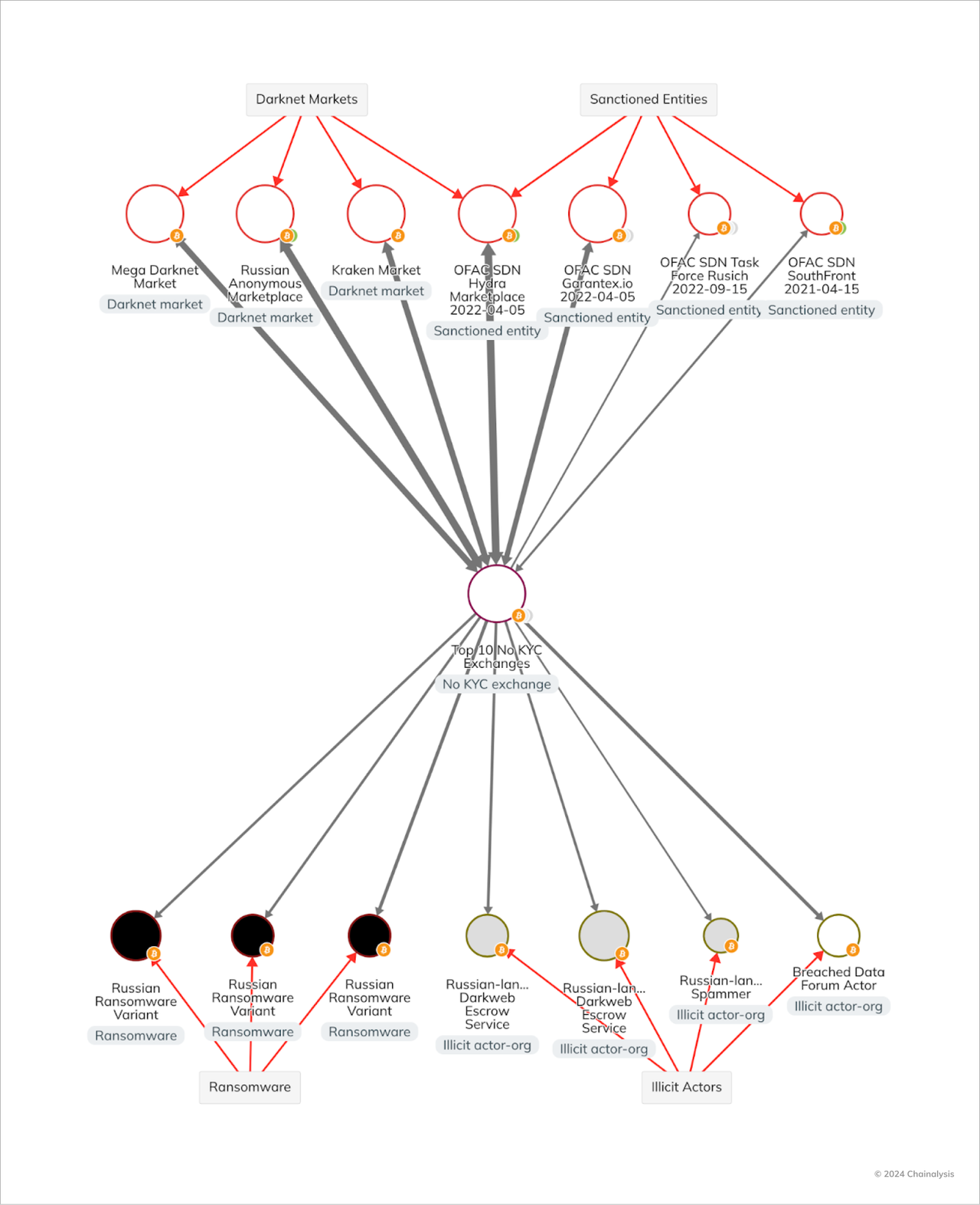 As their name suggests, no-KYC exchanges have no known process for collecting customer information before allowing any level of deposit or withdrawal. They do not require a name, phone number, or email address, and make no attempt to verify this information prior to permitting transactions. As such, these services allow a range of cybercriminals to abuse their services without KYC controls to identify or disrupt illicit activity. The BKA’s Operation Final Exchange landing page calls out ransomware affiliates, botnet operators, and darknet vendors as users of the 47 targeted exchanges. Beyond that, these services offered fiat on- and off-ramping for sanctioned Russian banks, creating an avenue for sanctions evasion.