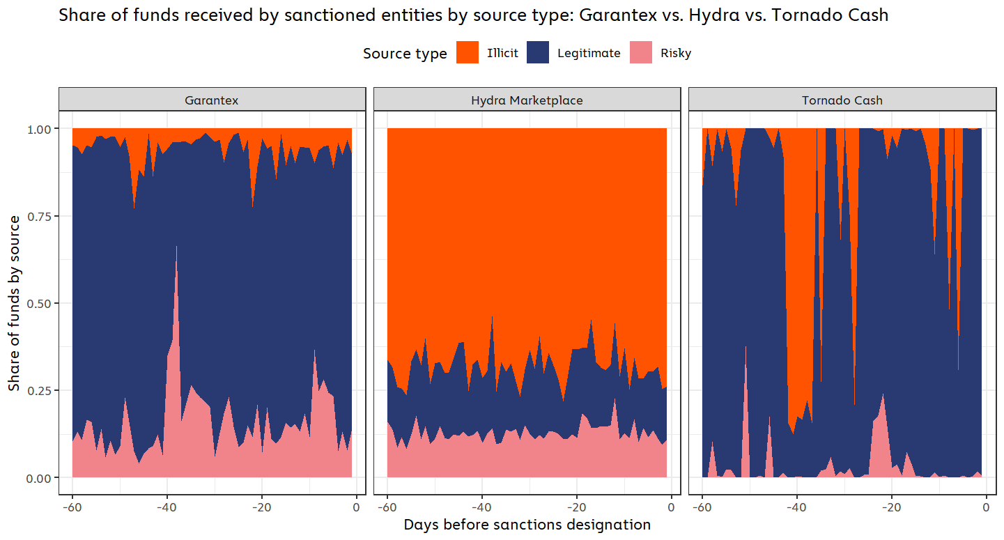 The chart above shows the breakdown of each sanctioned entities’ source of incoming funds in the 60 days prior to their designations based on whether the sending wallets were associated with legitimate, illicit, or risky activity. A few things stand out: