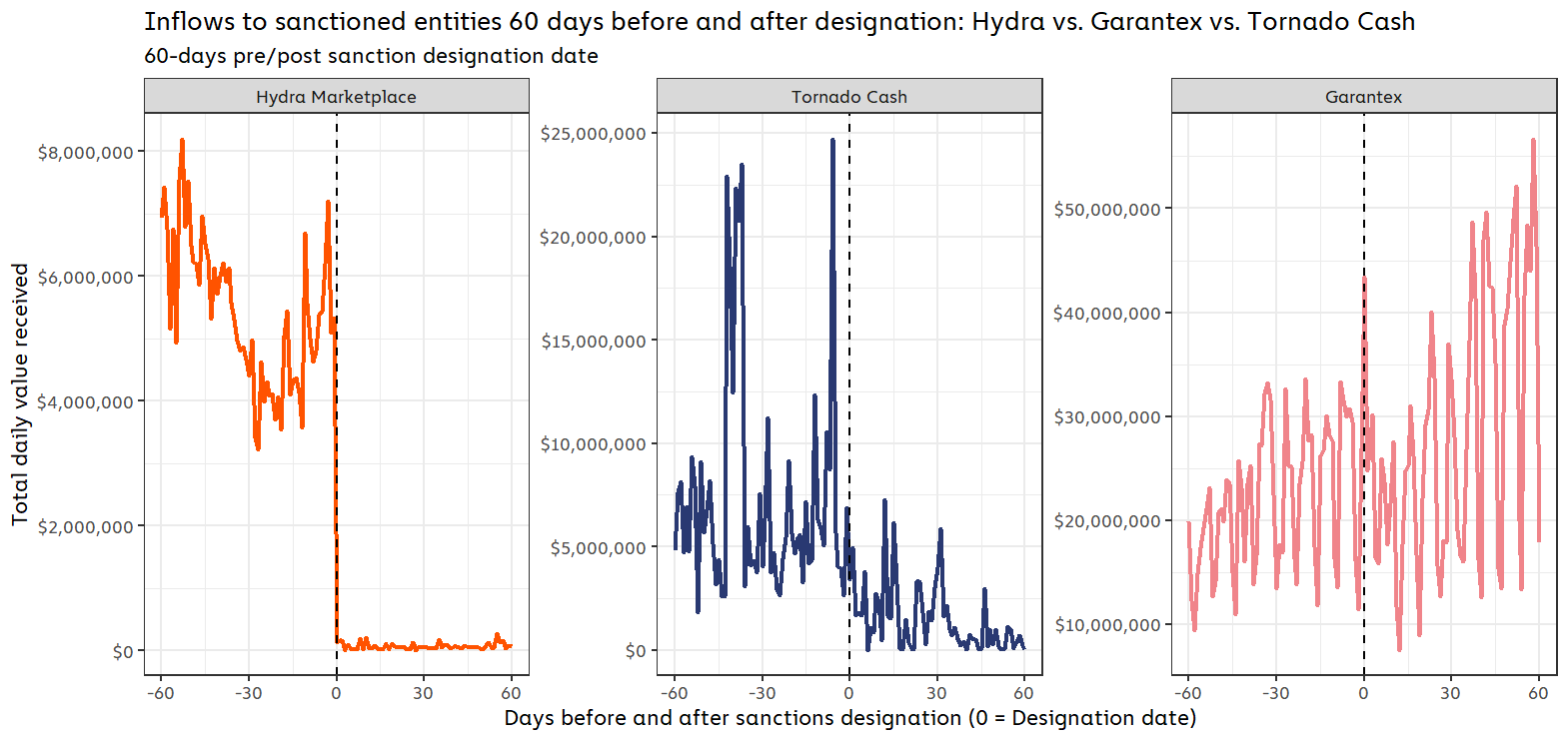 On-chain data shows that each of the three sanctioned services were affected differently by their designations. The charts below show cryptocurrency inflows for Garantex, Hydra, and Tornado Cash in the 60 days before and after they were sanctioned.